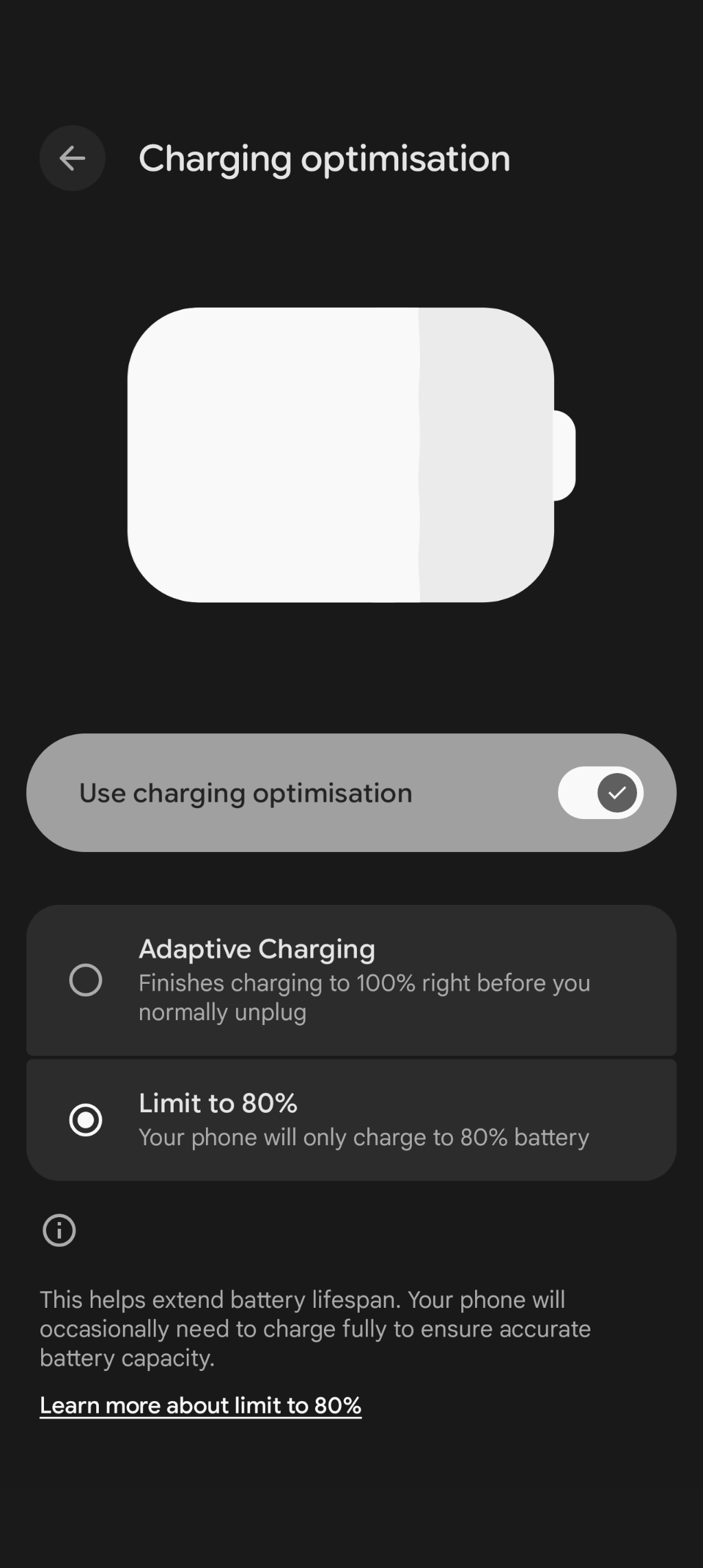 >>108657543lion battery longevity depends on voltage range you cycle it. theyre giving you the option to cycle it less so it lasts more whats wrong with that.people have been asking for that for years, on my old rooted lg a decade ago i had to use a third party app for that but it also allowed me custom ranges like set it so it charges up to 75% and doesnt start charging until its down to 65%