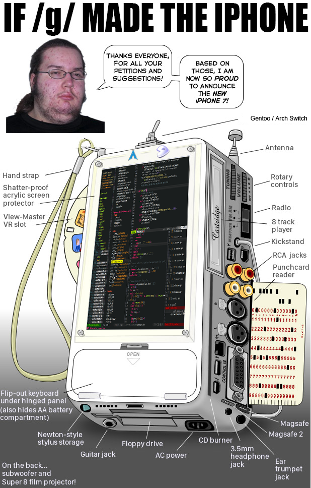 >>108657988reminds me of that one>if /g/ made the iphoneimagehooray for convenience, just staple a bunch of wackass converter peripherals to add real functionality until you get old portable phones anyway