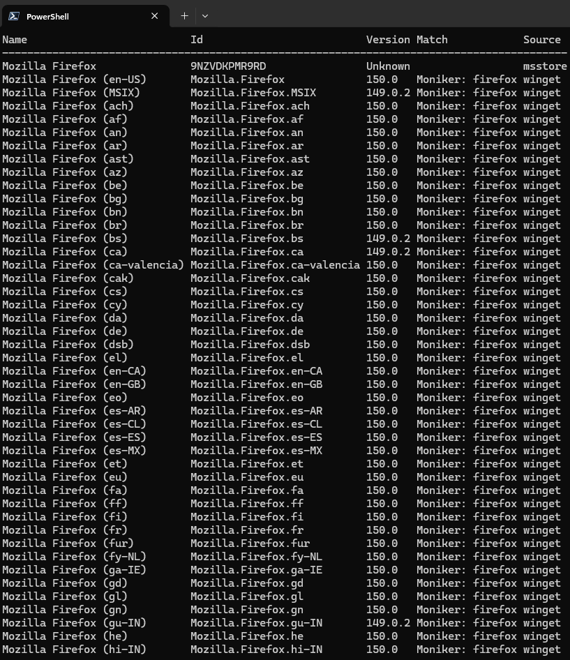 >>108662724Country codes for translations. Use `Mozilla.Firefox` if you speak English otherwise do like `Mozilla.Firefox.ca` or whatever language you need.