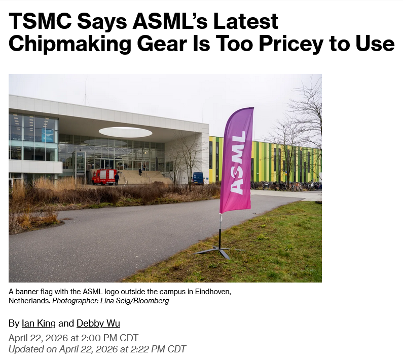 https://www.bloomberg.com/news/articles/2026-04-22/tsmc-says-asml-s-latest-chipmaking-gear-is-too-pricey-to-use