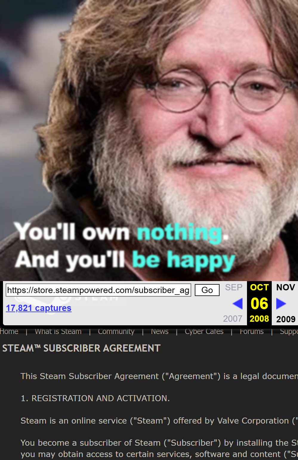 >>108676310Sharing or selling RuneScape accounts was a bannable offense. Hosting your own server for an MMO was legally gray or illegal even back then.Re-sales of CD keys were also illegal according to most EULAs back then. The internet just made this easier to enforce.Companies never want you to own anything. Valve didn't change this, they just moved this concept to the web. Nobody forced other companies to do the same.>>108676528>That's not how it works. You do not get kicked off when you log in.This is exactly how it works. He's talking about game sharing on Steam.>OLD; Simultaneous Play: Only one person can access the shared library at a time. If the owner starts playing any game, the shared user is immediately locked out or must exit.>NEW; Simultaneous Play: Members can play different games from the shared pool at the same time. If multiple members want to play the same title, they must own multiple copies of that game within the family.Also>Steam does not require DRMIt effectively does. You cannot launch a game without having the Steam Client unless you fuck around with the game files by removing the DRM.>>108676469Are you one of the retards pretending piracy is difficult and inconvenient? Downloading a game from a piracy website is just as easy as downloading a game on Steam, except you don't need to register an account or your debit card so it's actually even easier.