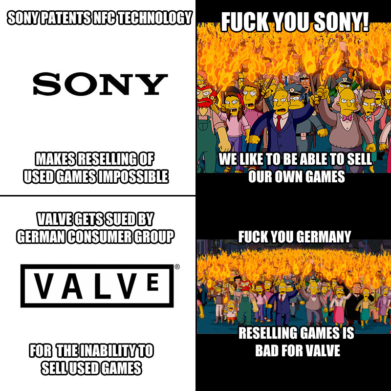 >>108681247>the situation would change DRASTICALLY if everyone with a steam copy could suddenly sell theirs for less than what the developer sells it forOkay? I really don't give a shit. Having the ability to sell the fucking property that you buy is significantly more important than the bottom line of a gaming company. I don't give a fuck what it will cost or what it will do to the community of game pirates, which seem to be your only concern. I want actual ownership. I do not want digital slavery.>you fundamentally misunderstand what i'm saying>again, DRM free does NOT mean digitally resellableYou have absolutely no idea what I'm trying to convey. Read everything again carefully...A DRM free game is effectively a free game. You can get it for $0. It never has to be purchased because it can just be pirated for free. If the ability to get indie games for free is not crushing indie game development, then the ability to re-sell games will have absolutely no impact.You're saying that if I sell a $20 game to my friend for $3, this will hurt indie devs. In reality my friend can just pirate the game anyway. So the worst case scenario is "nothing changes". But in reality this would only help indie devs. Because now I have an extra $3 to spend on indie games which I wouldn't normally have.>NO ONE would buy a "new" digital copy when a "used" copy is exactly the same and cheaperBy your logic games are basically killing themselves whenever the developers place discounts...You're just factually wrong. Most people have a limit of what they're willing to spend on games. If a $20 game never goes down to $5, then many people will just never buy the game at all or they'll pirate. But me selling the game for $5 would result in an economic contribution to the system. There'd be less of a demand for piracy, so game devs will get paid more.