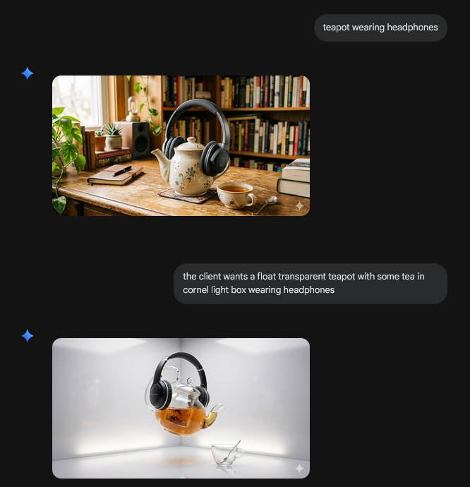 >>108675682except come up with an interesting and original idea.>>108675744GenAI has no agency and can't come up with original ideas on its own. It still needs a human driving force behind it. Also if something is not in it's dataset it can't create it. I tried making a teapot wearing headphones a while back with genAI and it couldn't do it so I just made it myself in 3D. Maybe models can do it now but last year they couldn't do it.