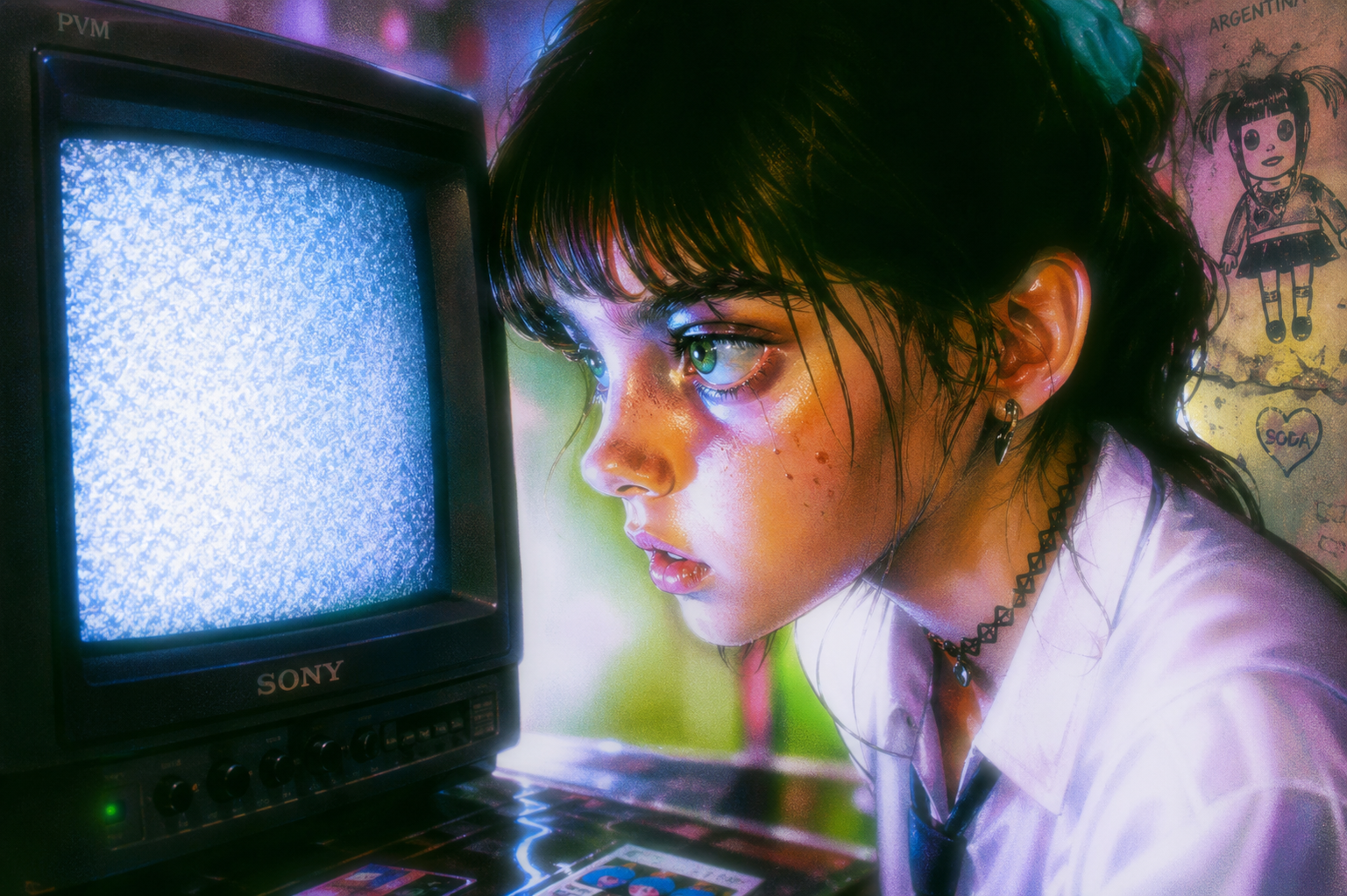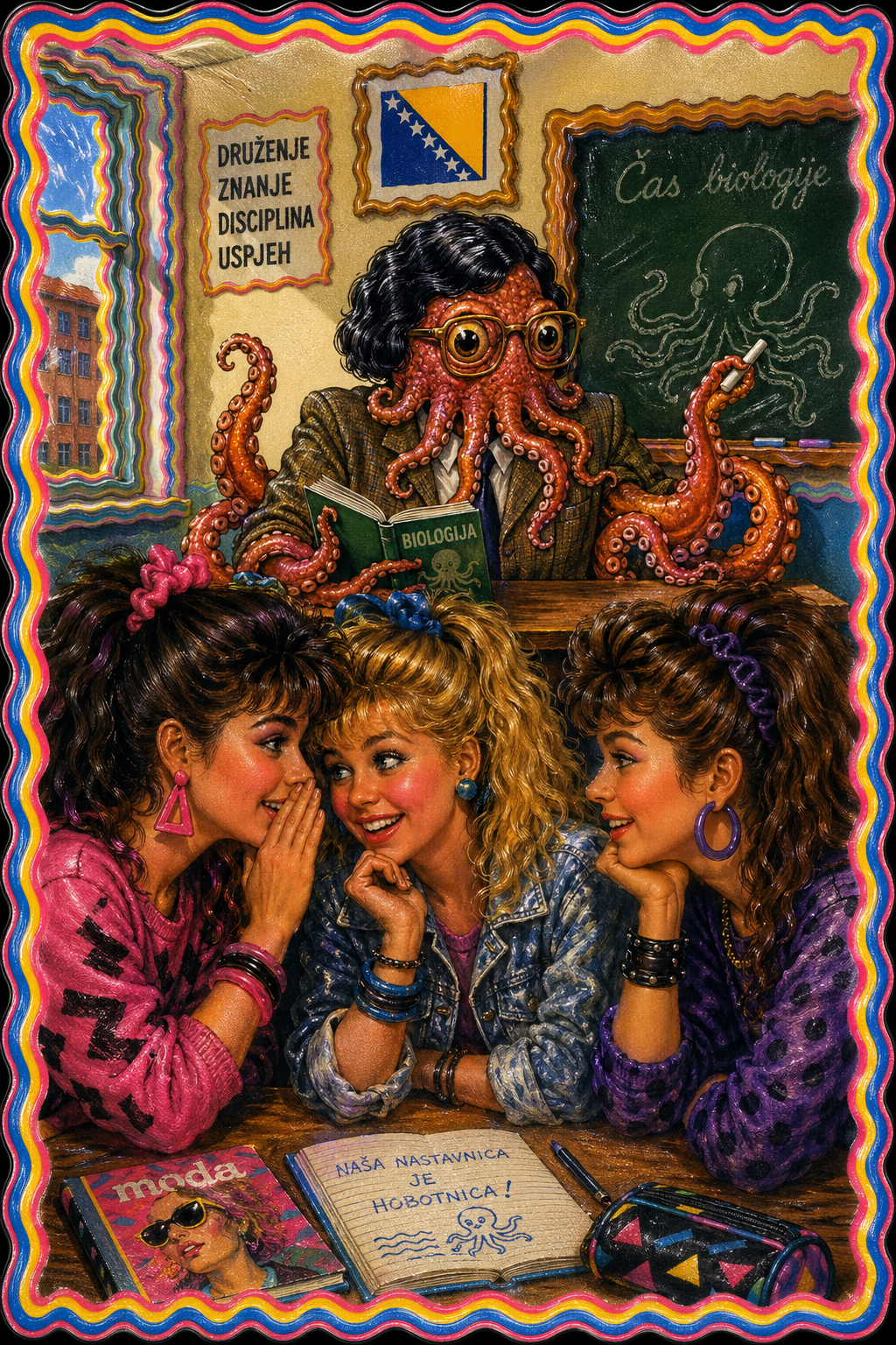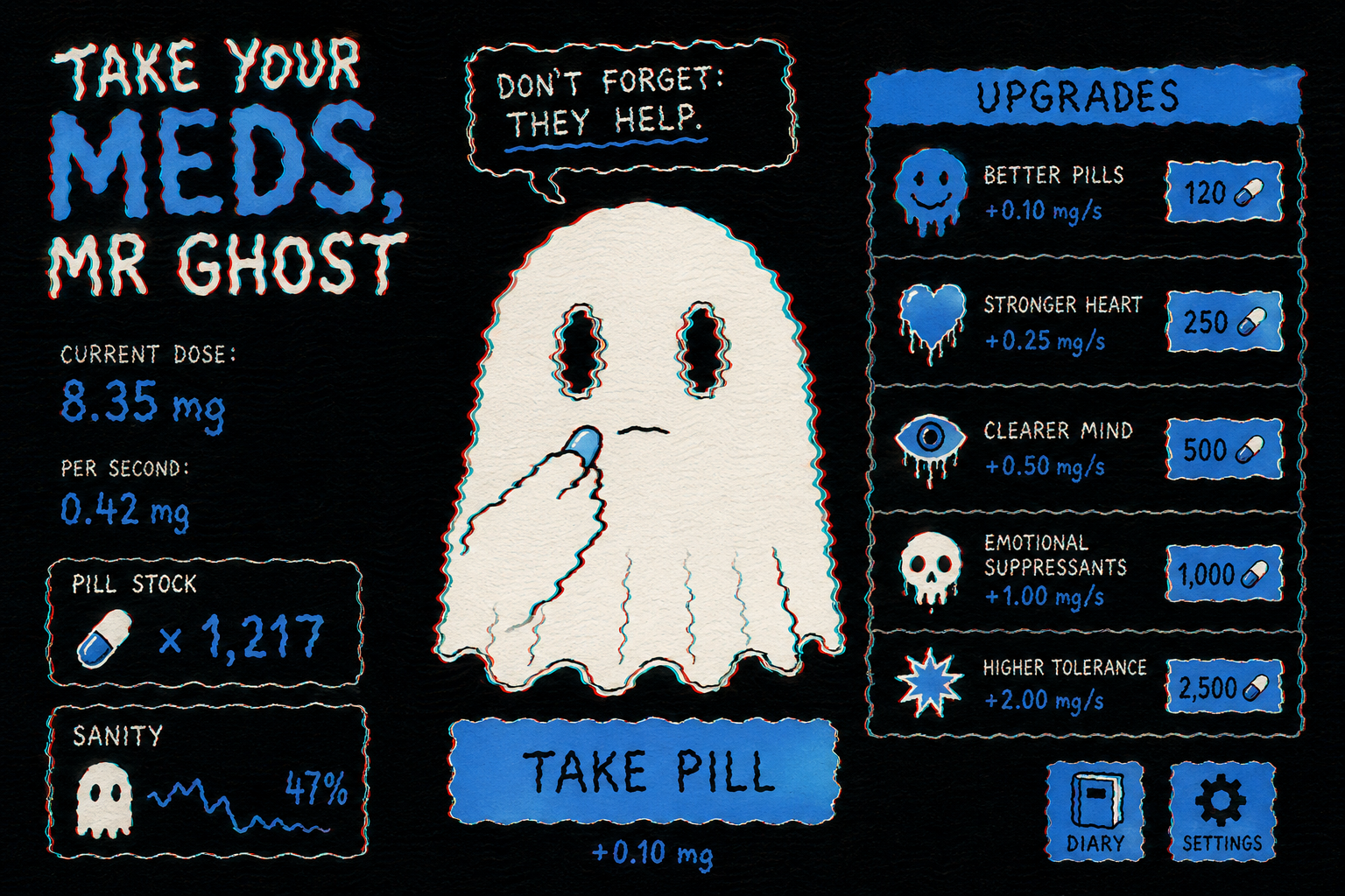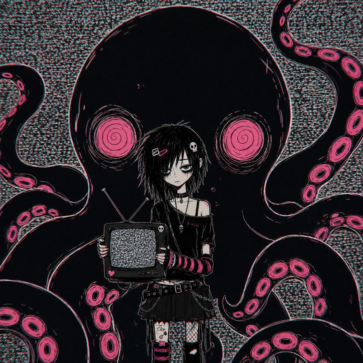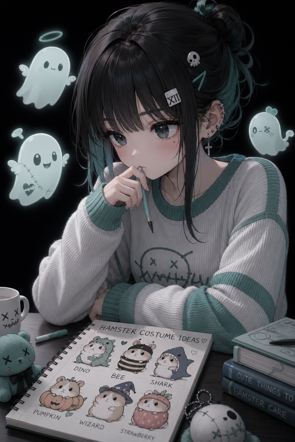 smug girl wearing striped sweater and shorts, lifting up foot. stunned onlooking ghost. pill capsules and and octopus floating in the background.
