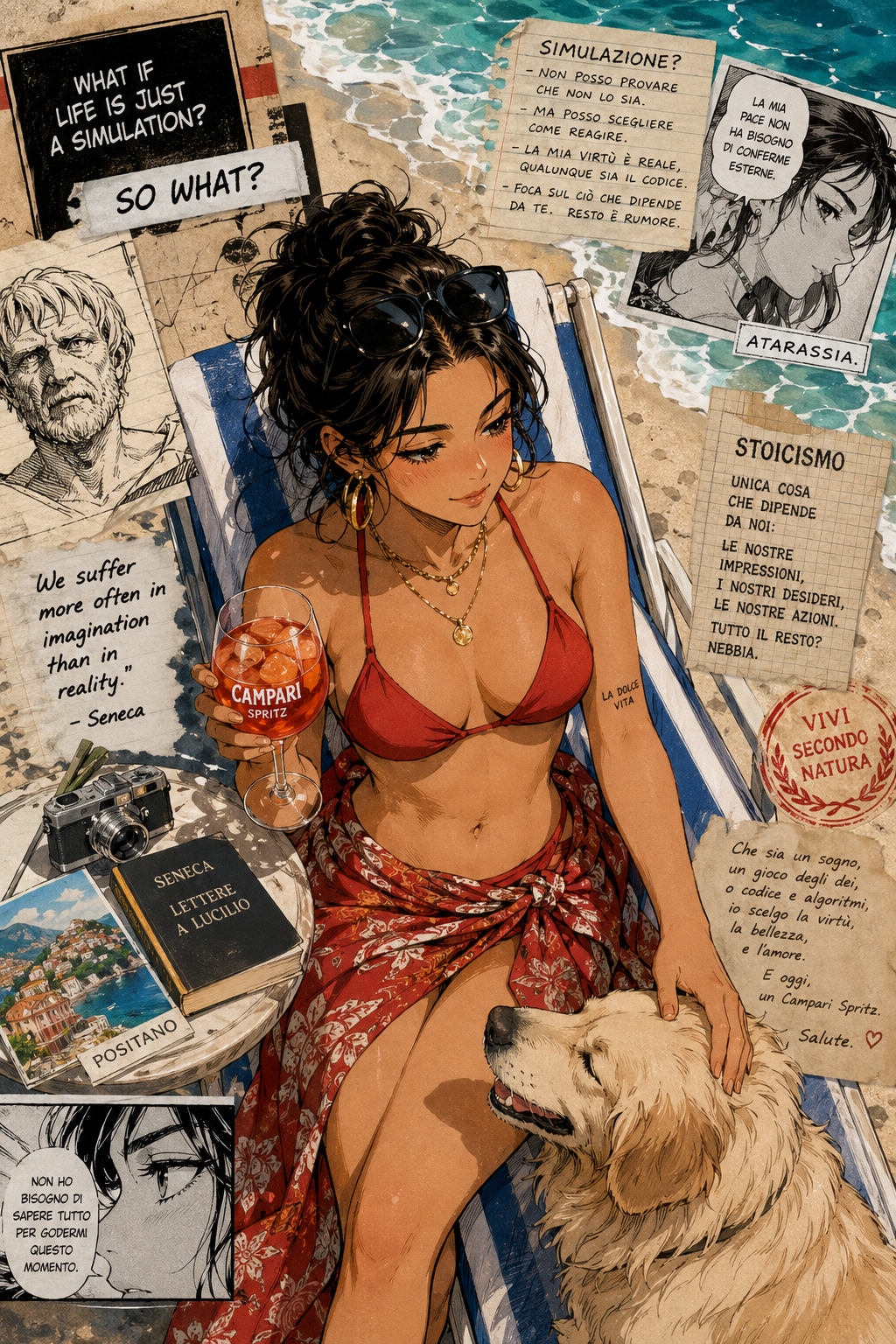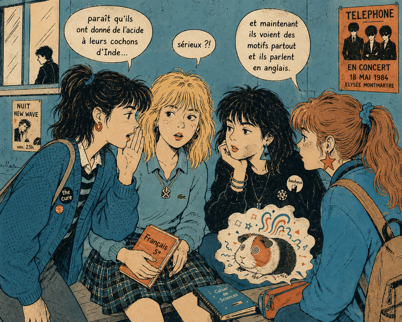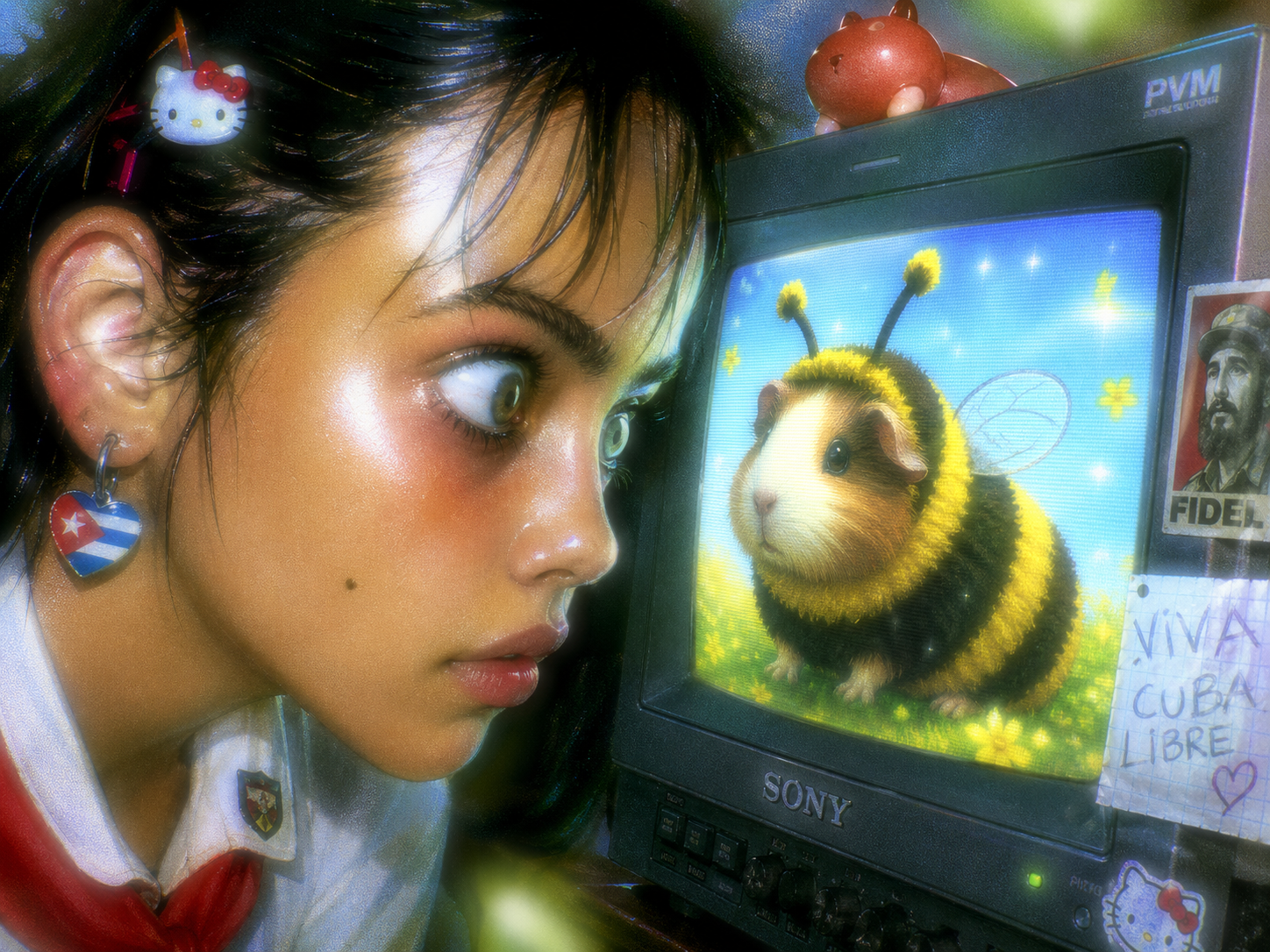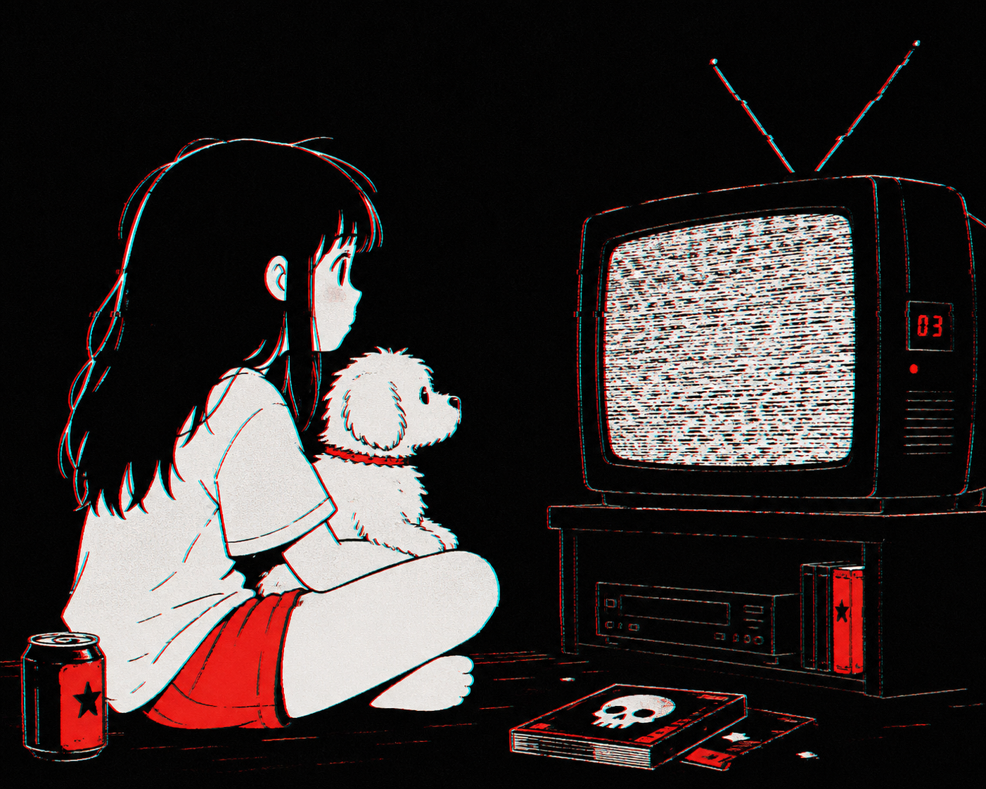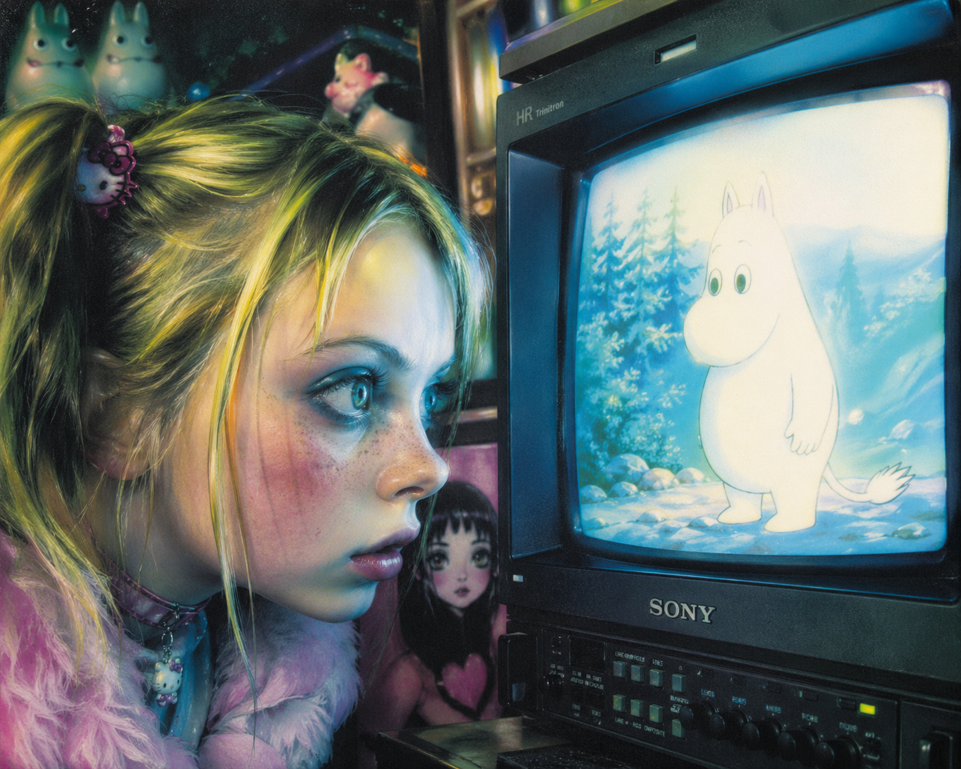 smug girl wearing striped sweater and shorts, lifting up foot. stunned onlooking ghost. pill capsules and and octopus floating in the background.
