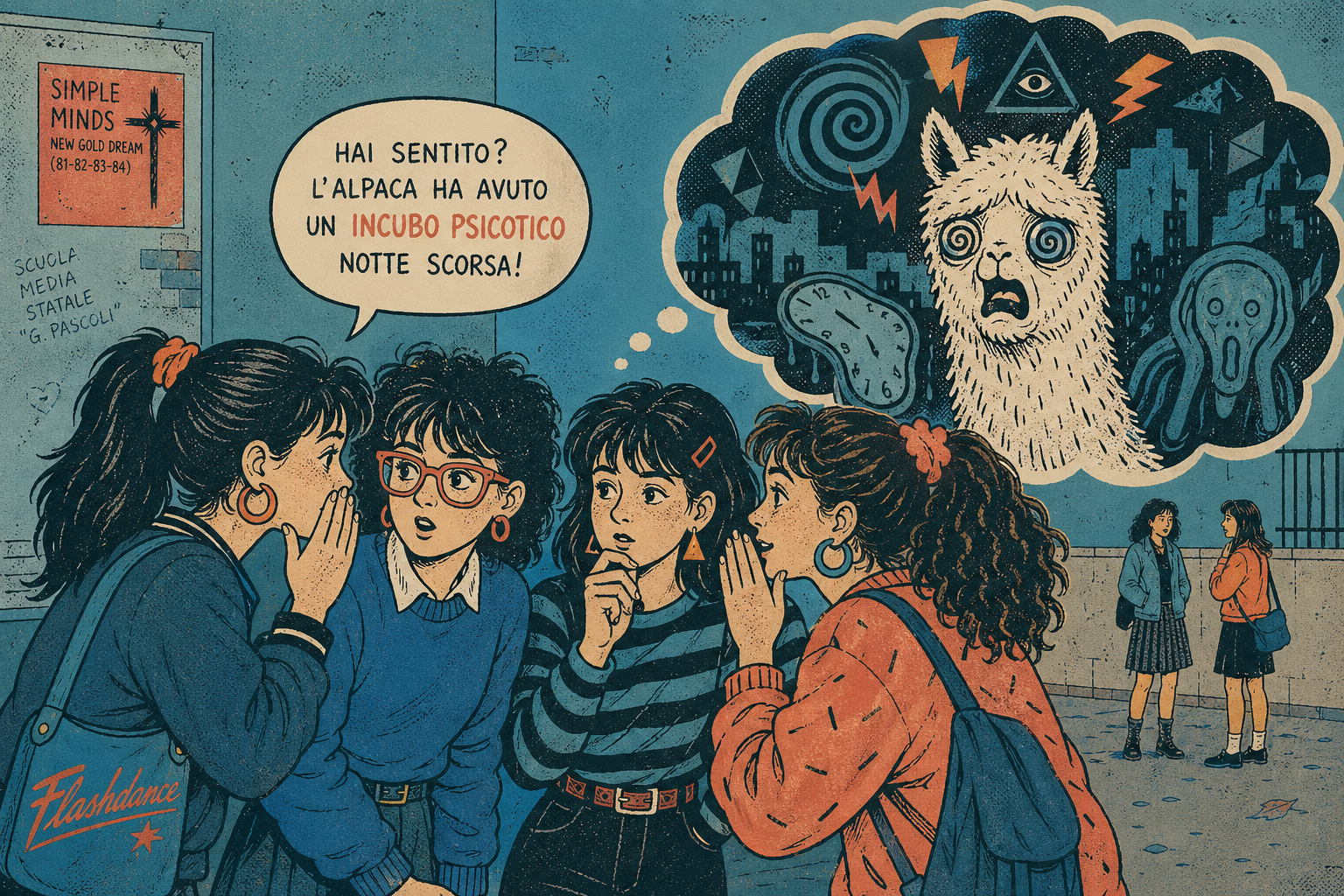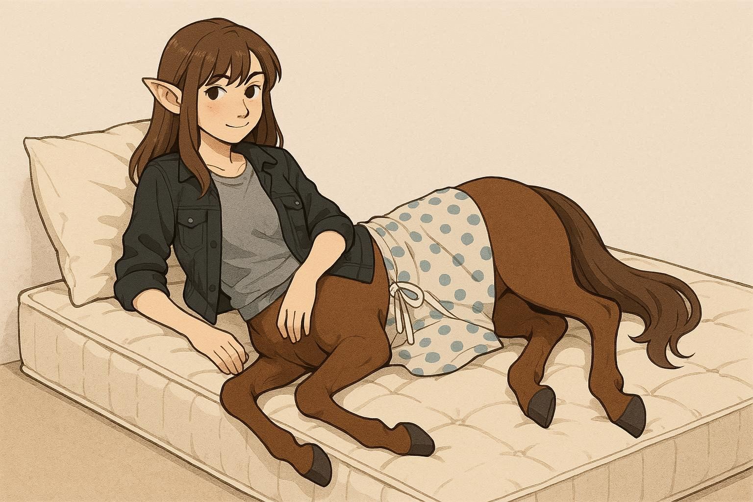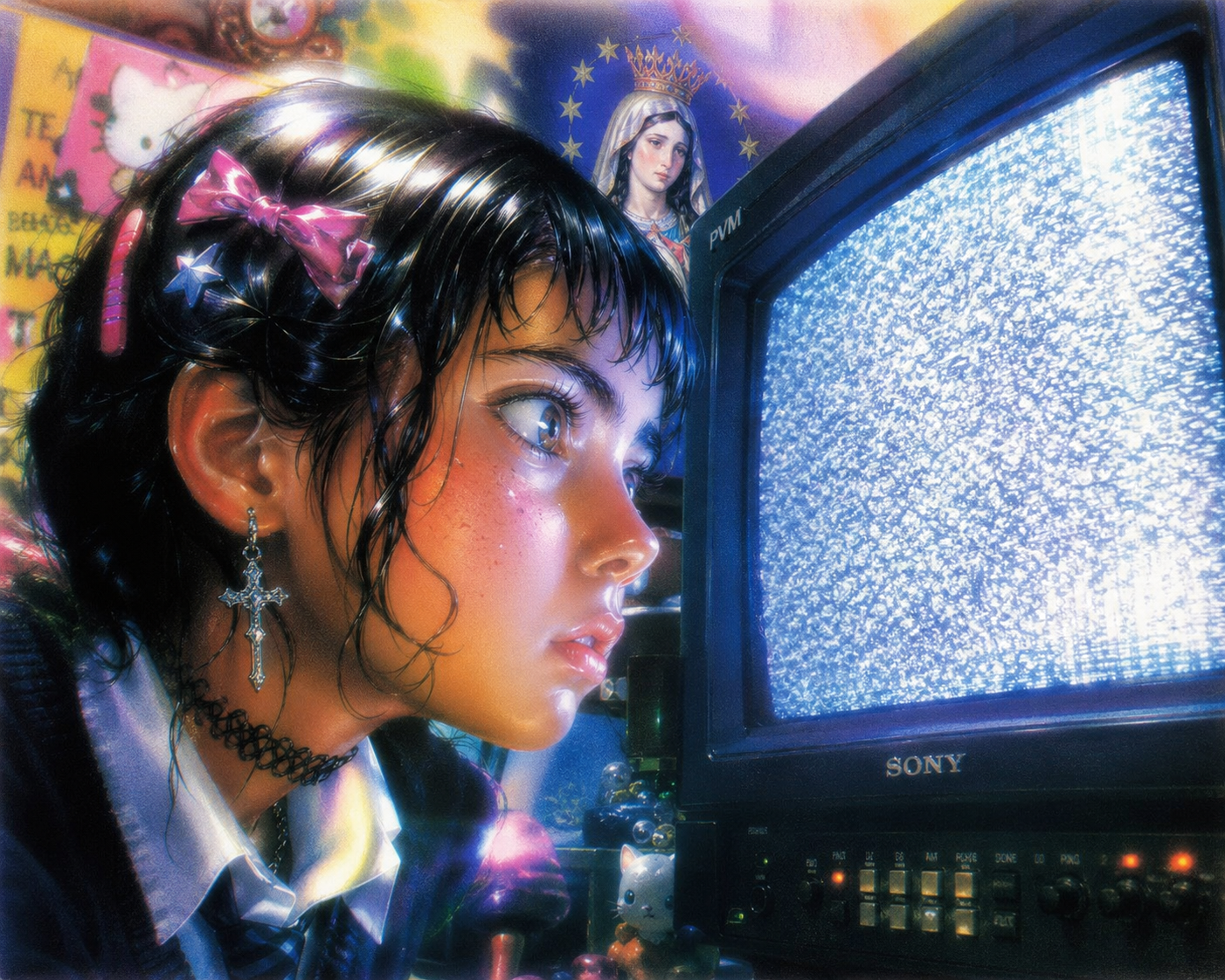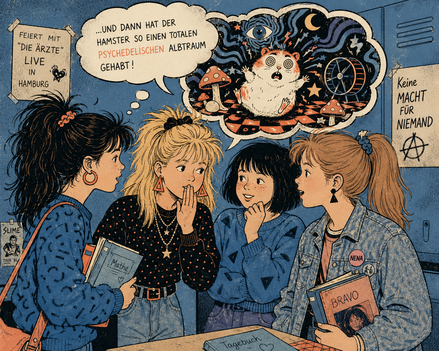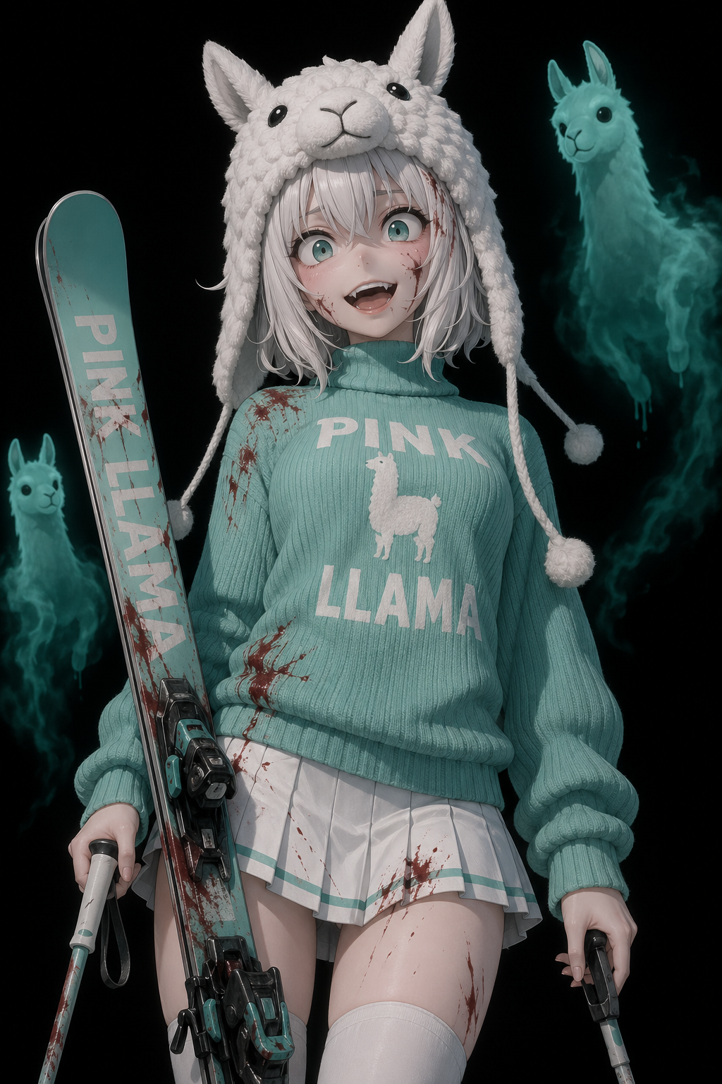 smug girl wearing striped sweater and shorts, lifting up foot. stunned onlooking ghost. pill capsules and and octopus floating in the background.