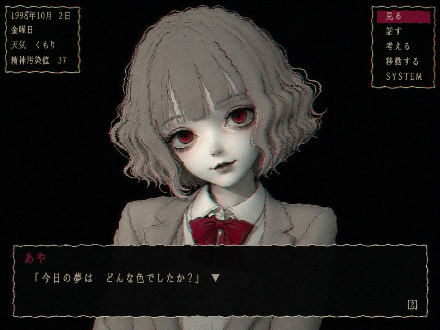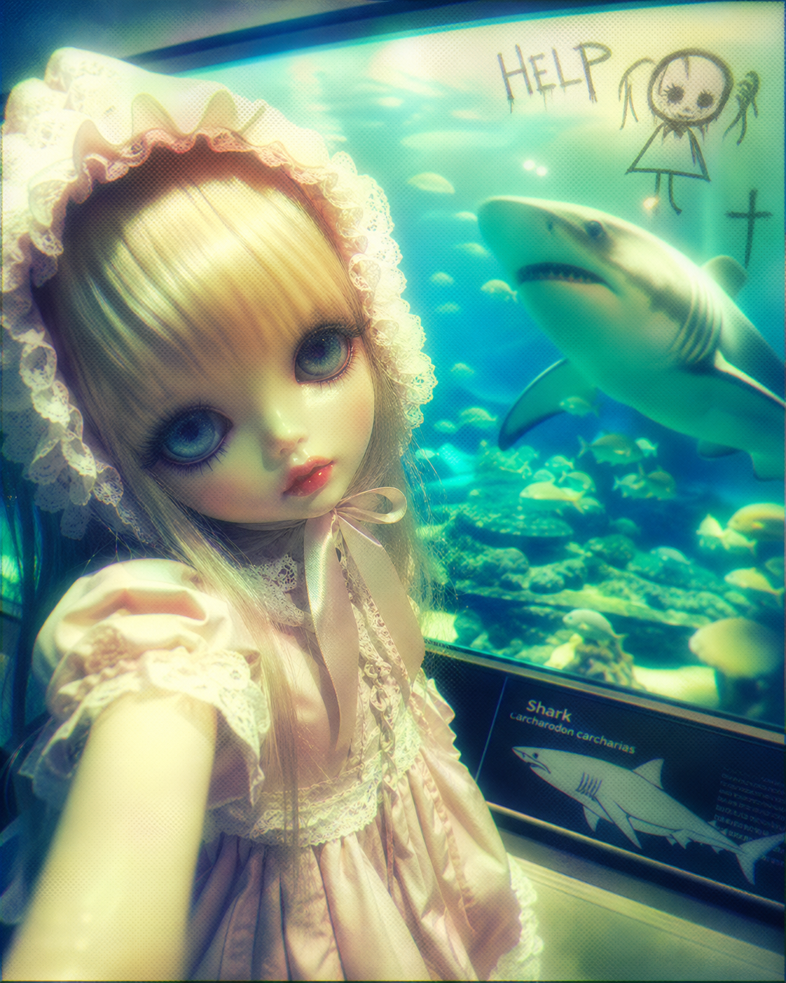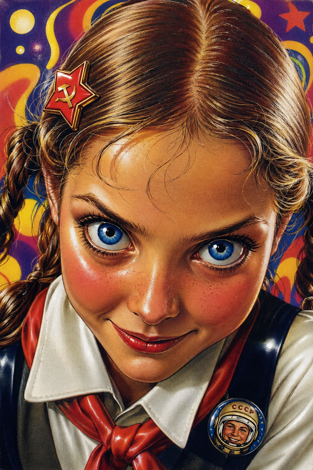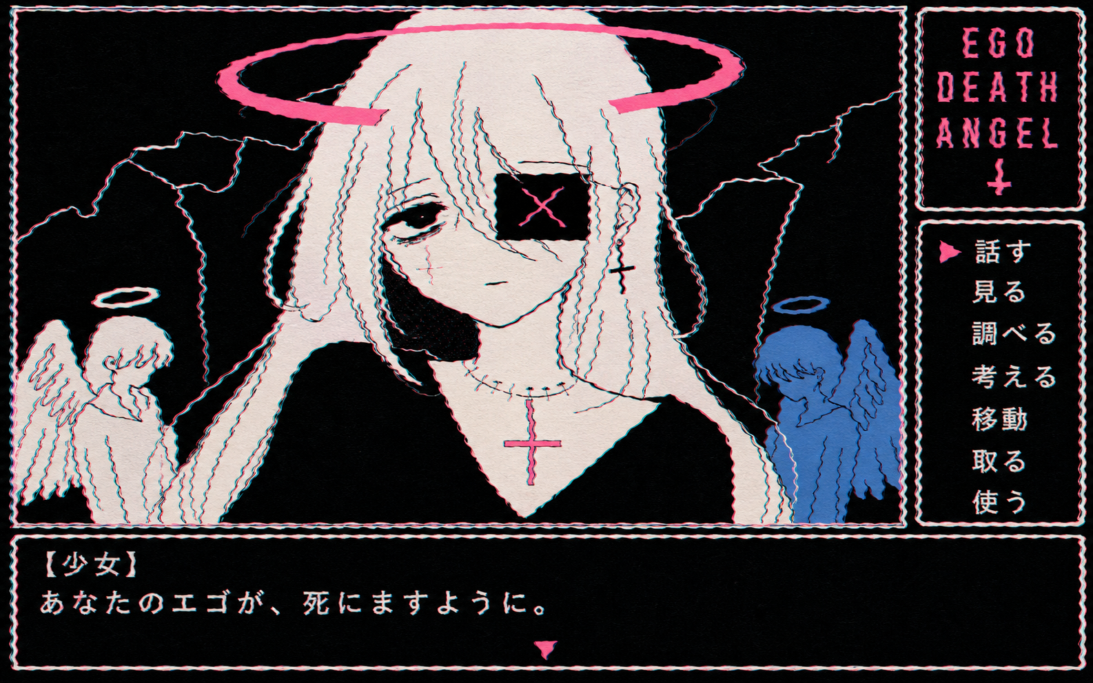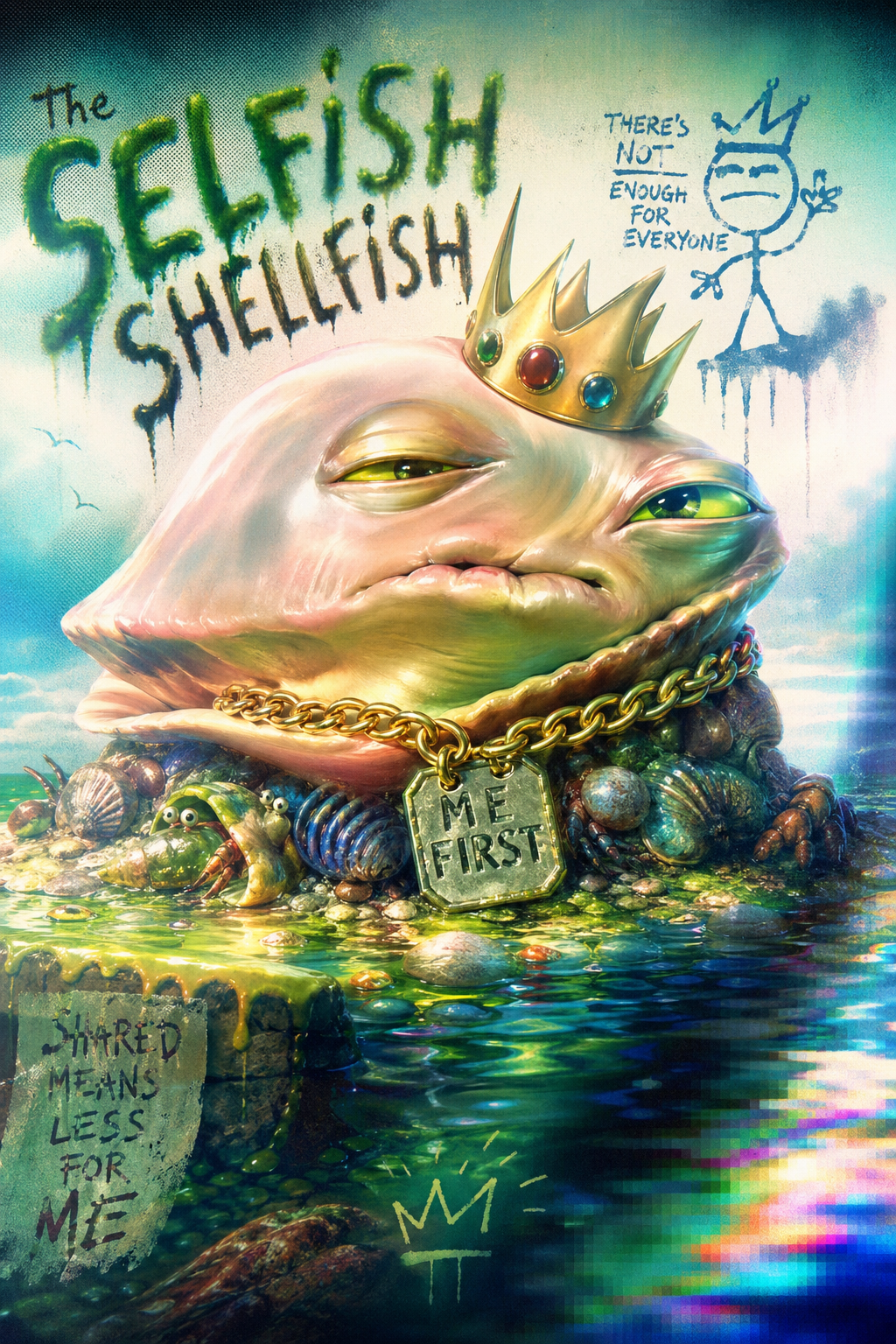 smug girl wearing striped sweater and shorts, lifting up foot. stunned onlooking ghost. pill capsules and and octopus floating in the background.
