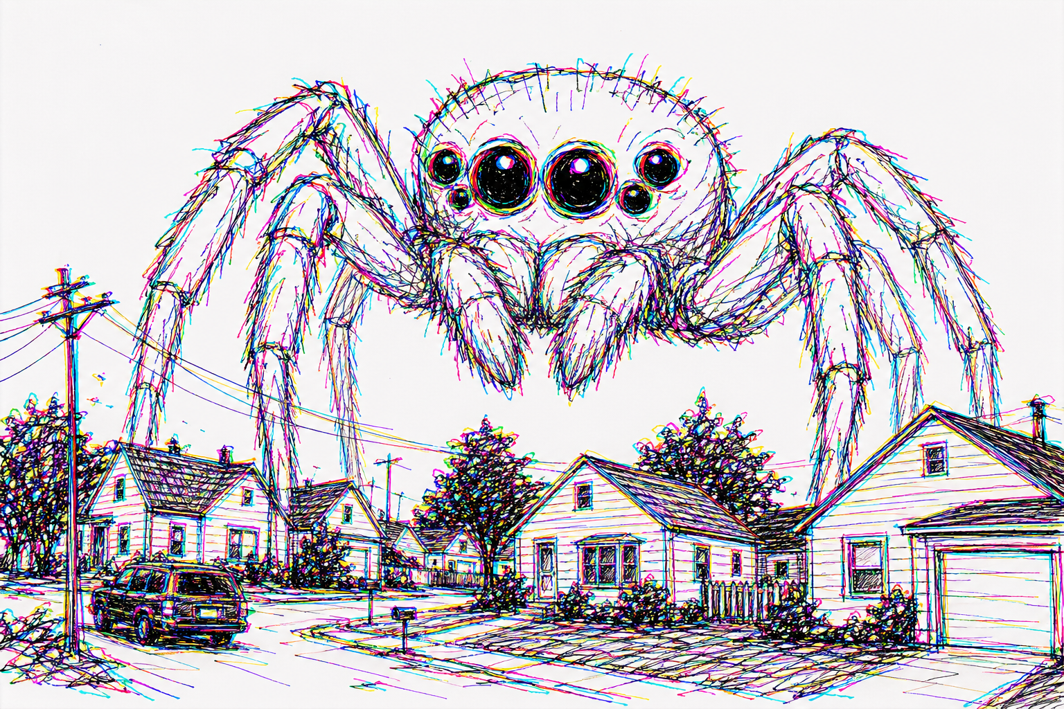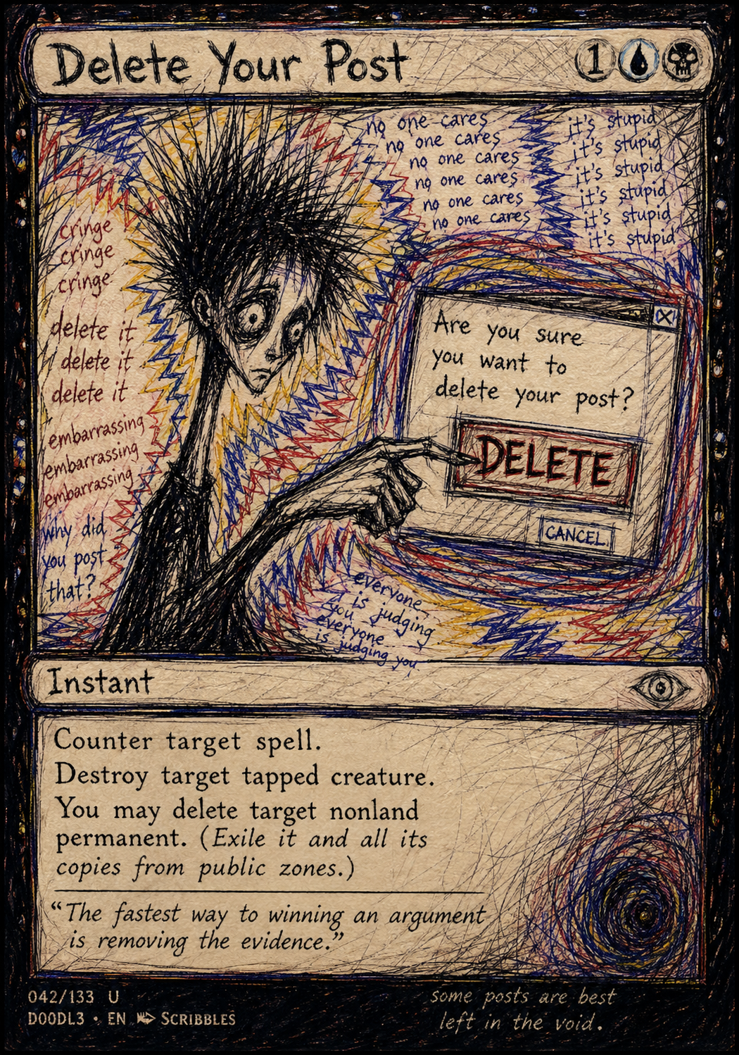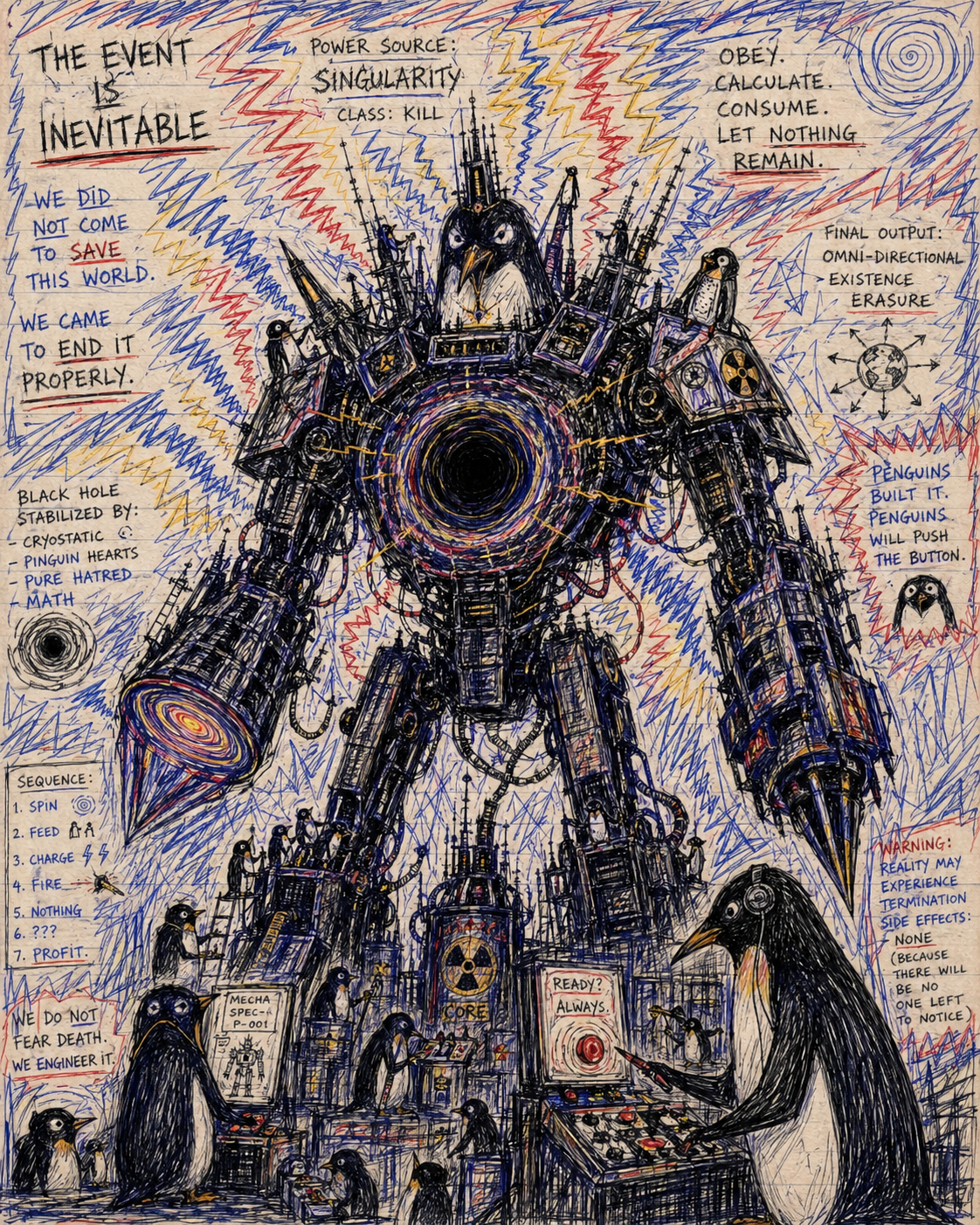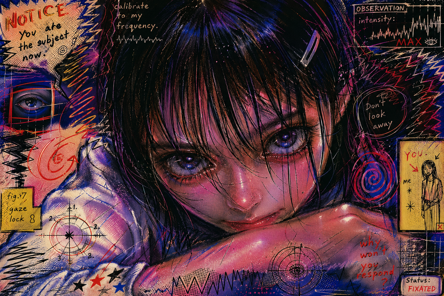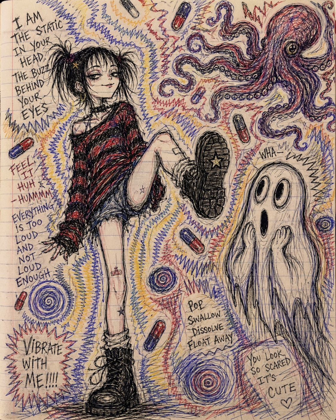 A recurring motif in this style is the use of "vibrational" or radiating energy patterns. Subjects are frequently surrounded by thick, jagged zig-zags, concentric spirals, and erratic hatching that suggest a humming, restless aura. These patterns often employ a primary-heavy color palette—blues, yellows, and reds—clashing against the dark, heavy ink of the central figures. The integration of handwritten text functions as a structural component of the composition, often trailing off or following the contours of the vibrating energy. The overall atmosphere is one of high-frequency tension, where the boundary between the subject and a chaotic, static-filled environment is blurred through constant, repetitive motion in the pen strokes.