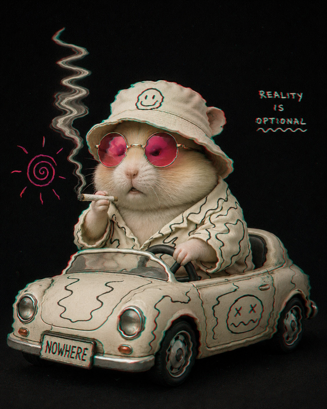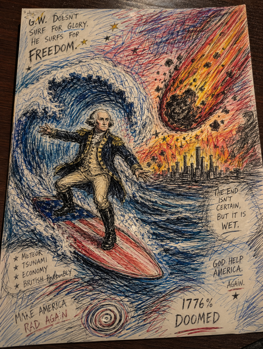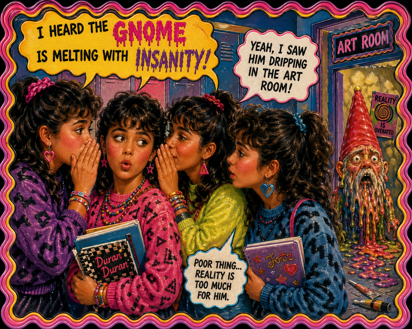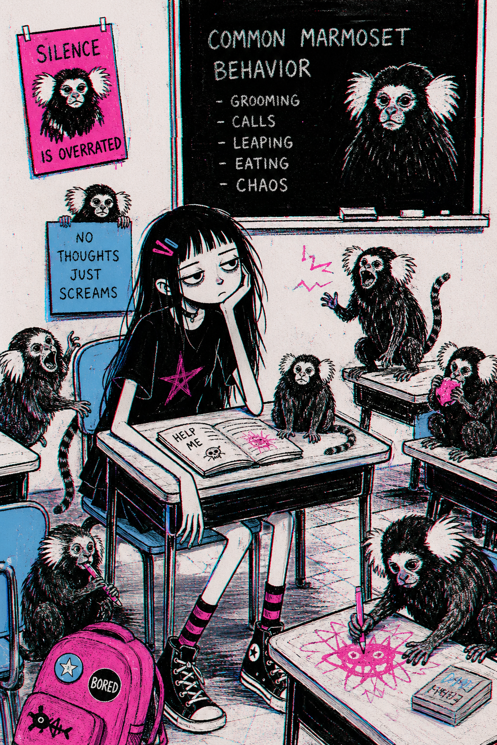 A recurring motif in this style is the use of "vibrational" or radiating energy patterns. Subjects are frequently surrounded by thick, jagged zig-zags, concentric spirals, and erratic hatching that suggest a humming, restless aura. These patterns often employ a primary-heavy color palette—blues, yellows, and reds—clashing against the dark, heavy ink of the central figures. The integration of handwritten text functions as a structural component of the composition, often trailing off or following the contours of the vibrating energy. The overall atmosphere is one of high-frequency tension, where the boundary between the subject and a chaotic, static-filled environment is blurred through constant, repetitive motion in the pen strokes.