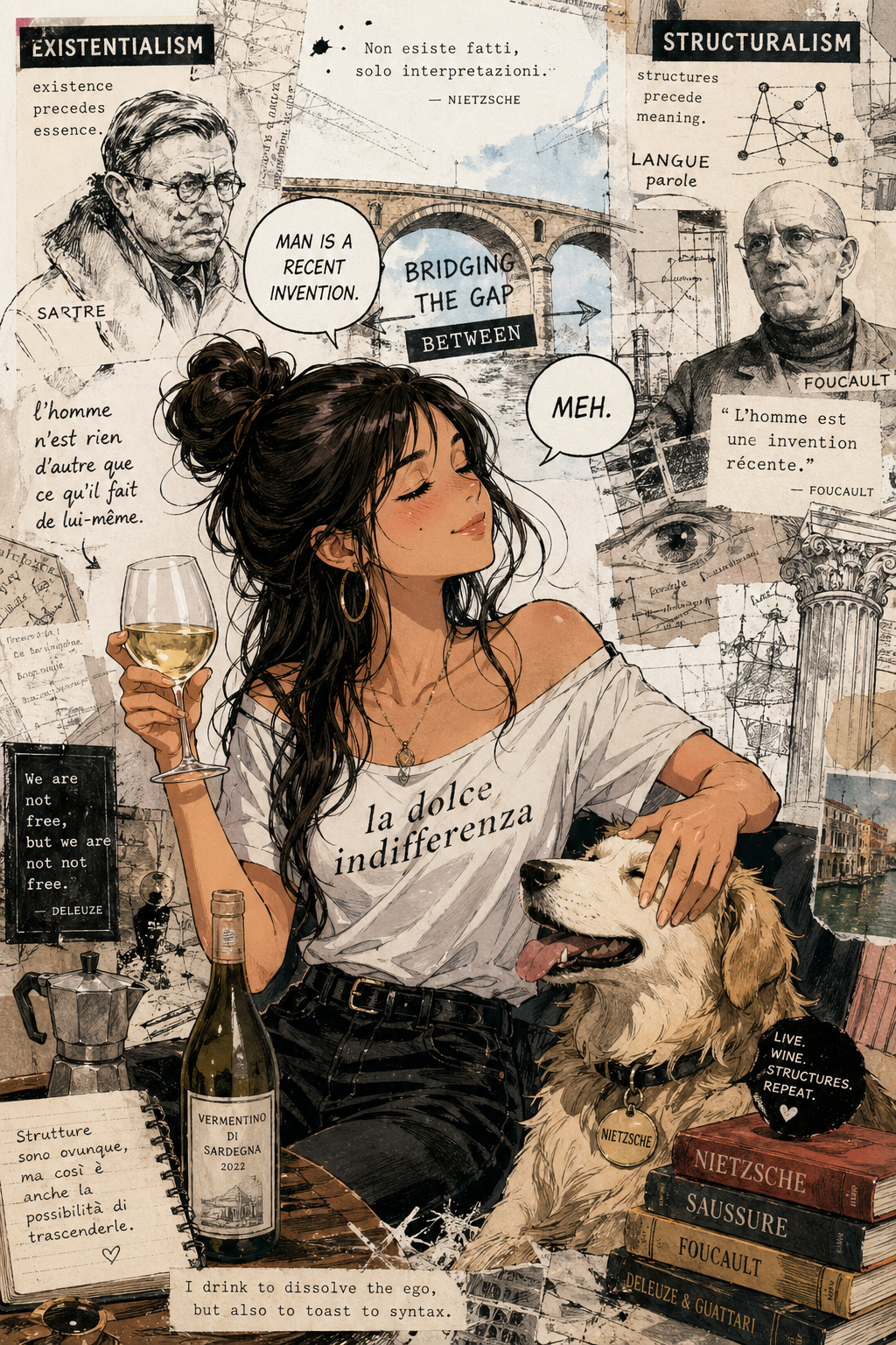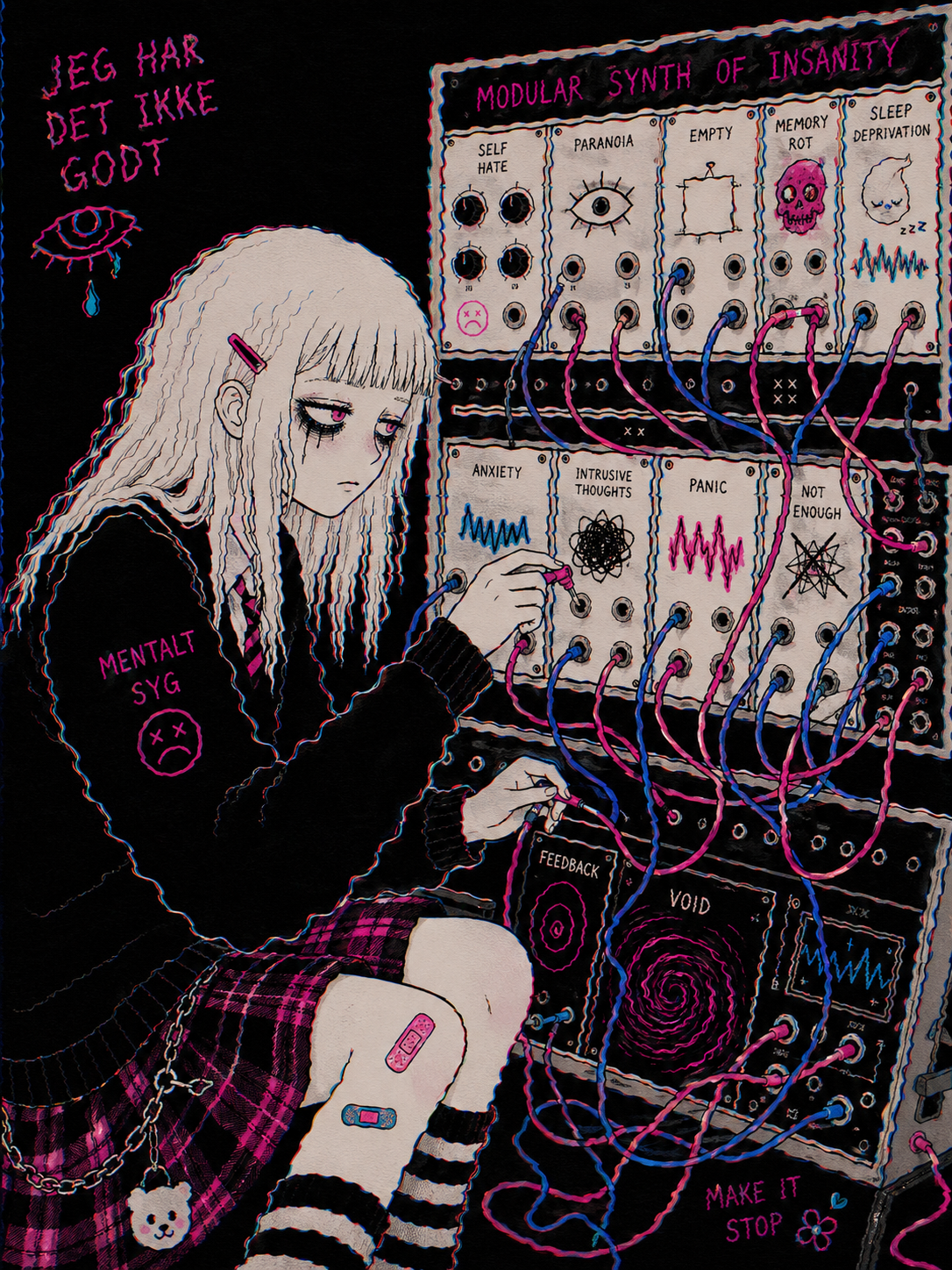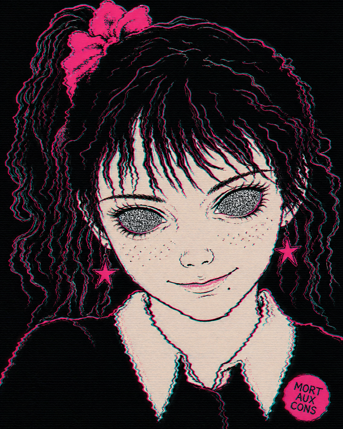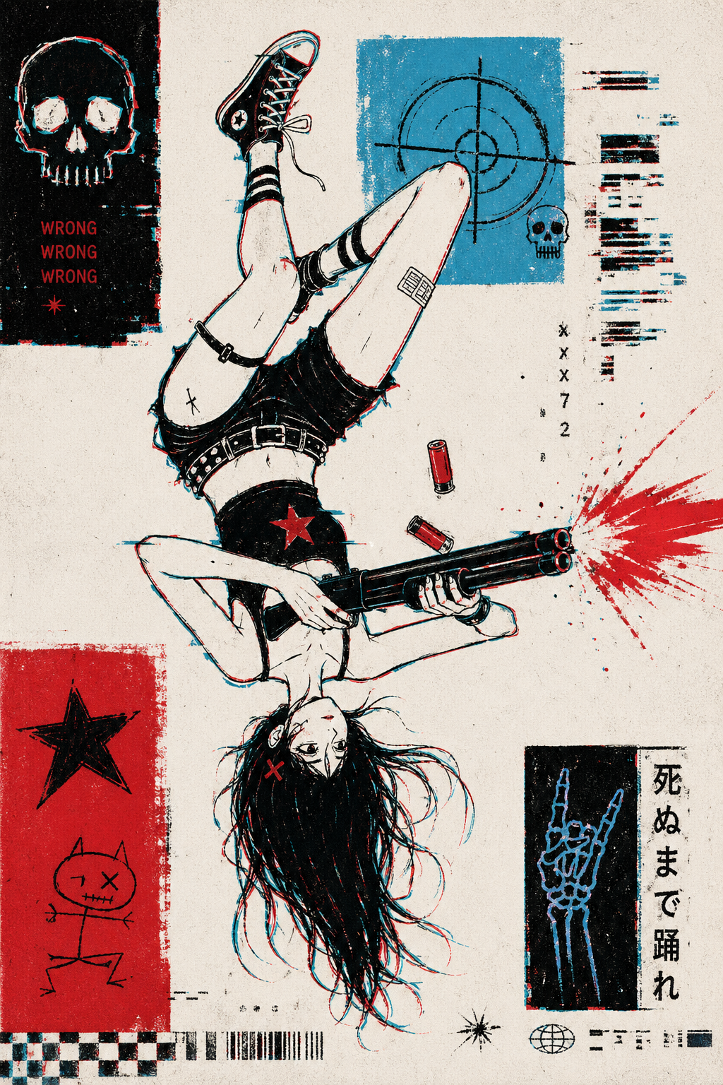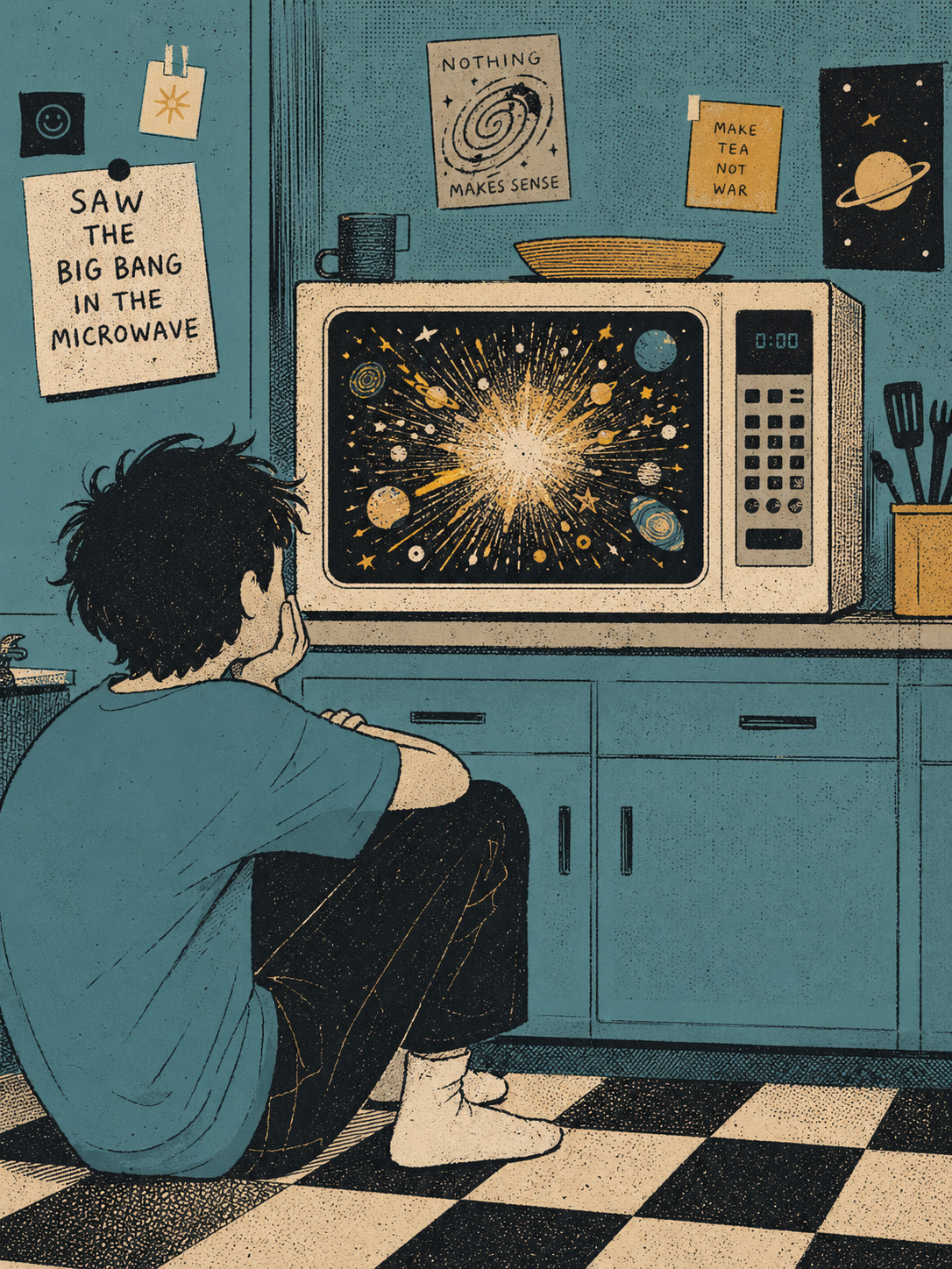 A recurring motif in this style is the use of "vibrational" or radiating energy patterns. Subjects are frequently surrounded by thick, jagged zig-zags, concentric spirals, and erratic hatching that suggest a humming, restless aura. These patterns often employ a primary-heavy color palette—blues, yellows, and reds—clashing against the dark, heavy ink of the central figures. The integration of handwritten text functions as a structural component of the composition, often trailing off or following the contours of the vibrating energy. The overall atmosphere is one of high-frequency tension, where the boundary between the subject and a chaotic, static-filled environment is blurred through constant, repetitive motion in the pen strokes.
