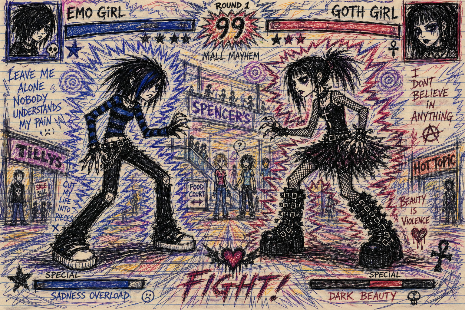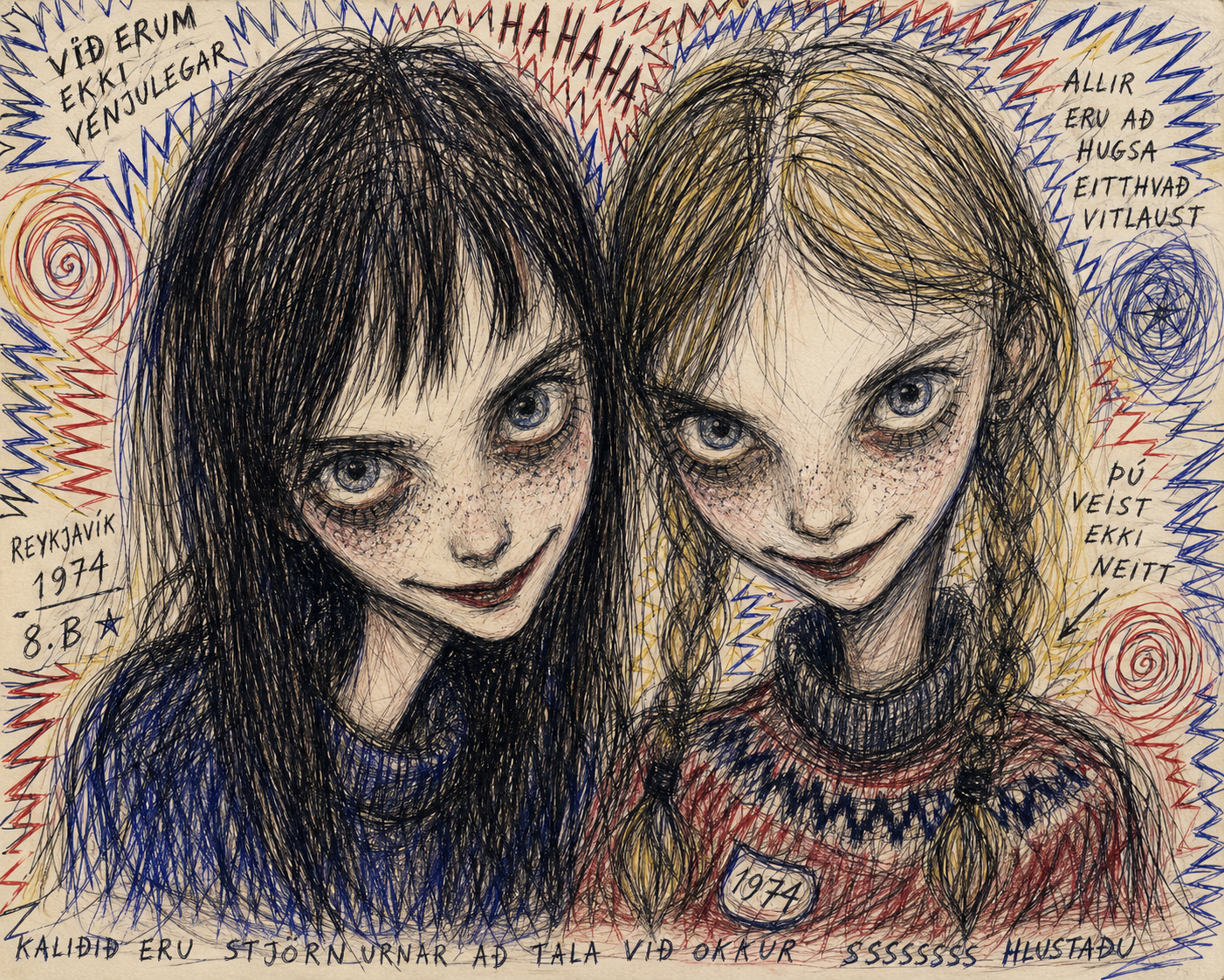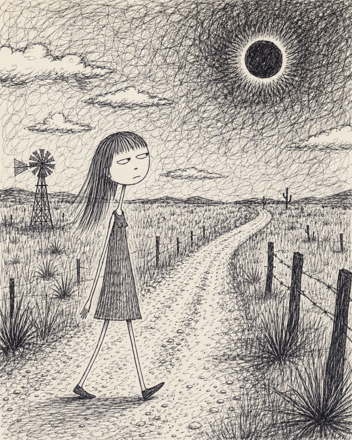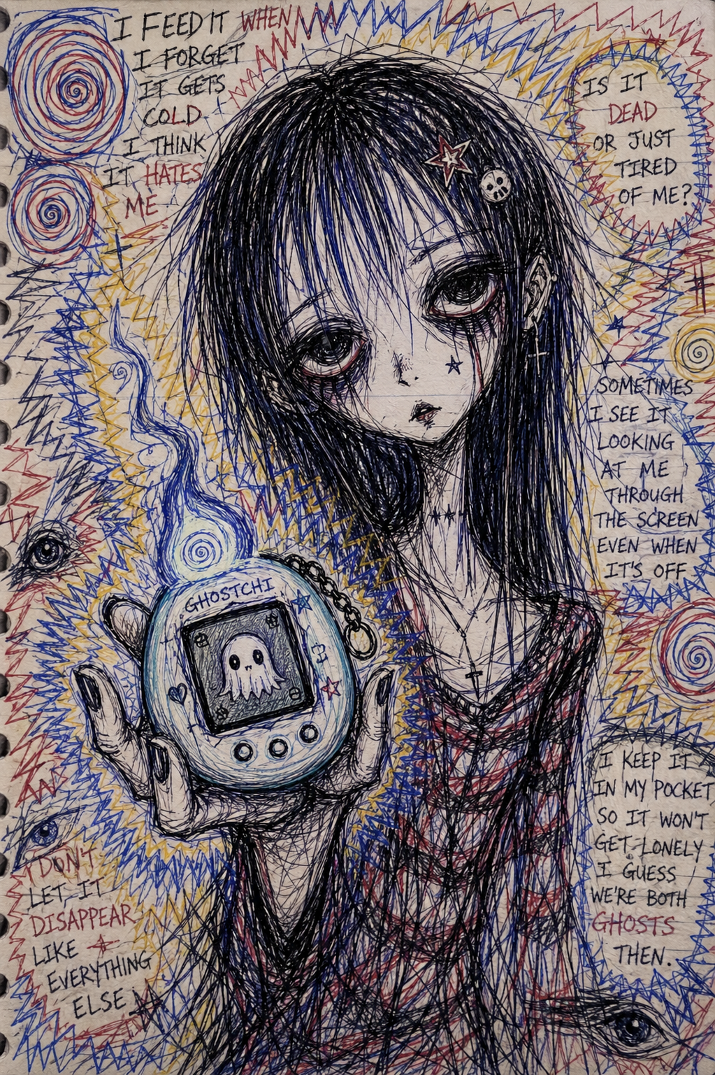 This aesthetic is defined by a raw, scratchy, and jittery illustrative style that emphasizes internal psychological states through frantic line work. The visual language is deeply rooted in an "outsider art" or "notebook doodle" tradition, utilizing utilitarian tools like ballpoint pens and colored pencils on lined or plain paper. The subjects are rendered with fragile, spindly proportions—elongated necks, wide-set eyes, and sharp, jagged features—that convey a sense of vulnerability and physical lightness. The line quality is intentionally nervous and unrefined, prioritizing the immediacy of the mark over formal anatomical correctness.