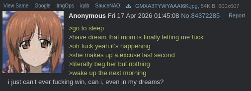 >>108692762My point is that to get what you want, don't think about ANYTHING else or you severely hurt your chances of getting it. The obviously paradoxical nature of having to not think about not thinking about it makes it tricky, but its a skill that can be "learned". My best successes usually came after strings of failures within relatively short time periods.>>108692918That's interesting, for me it certainly is only uncharted territory that causes an instant wakeup. Oddly this only applies to sex and death/severe injury. Anything more mild than that even if totally new and just as emotionally impactful doesn't usually do it.>>108692946I've never been able to purposefully induce a lucid dream. They just happen sometimes.>>108692991>the next jerkoff session is bound to feel great, because of how worked up you gotWell sure, if you do it right after you wake up. If you mean the tension somehow carries over even after that wave of arousal fades, then that's unfamiliar to me.