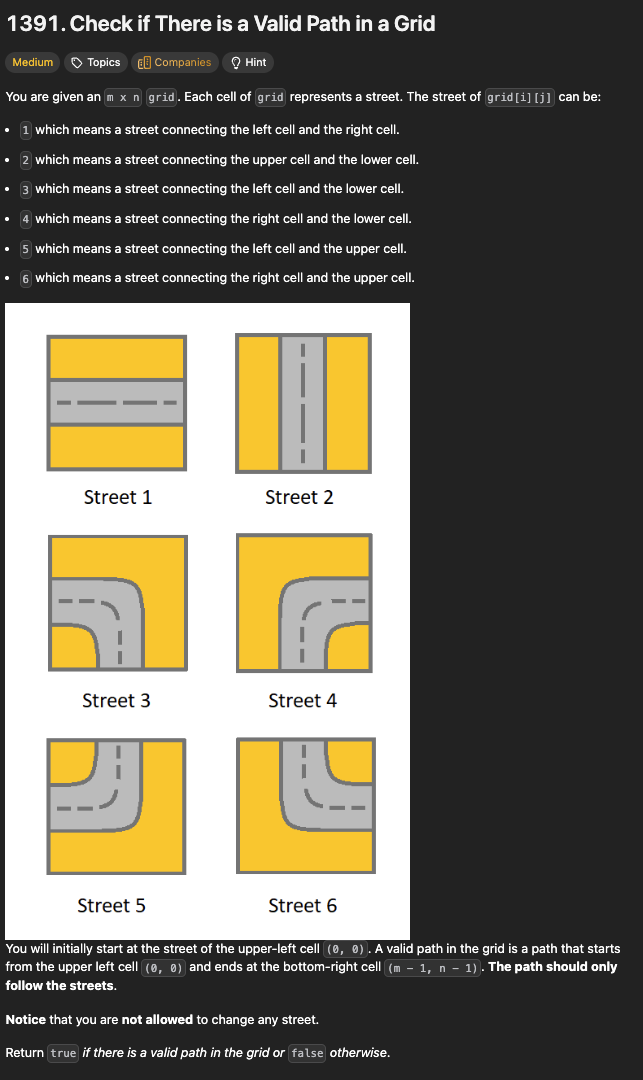 >>108698295Create a map tile + direction + next map tile to grid cell displacement, so a map key would be like Street 1 + east + Street 3 + and the map value would be the displacement coordinates would be (1, 0). Create an infinite loop with a break at the end. Starting at (0,0), check if a key exists for current tile + eastern tile or current tile + southern tile. If there's a valid key, proceed to the next grid cell based on the displacement values. Keep repeating the process of checking each 4 directions from the current cell for a valid key and getting the displacement values until you've reached the end (returning true) or exit with false there's no valid key.