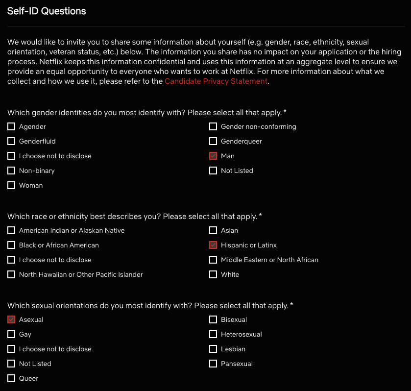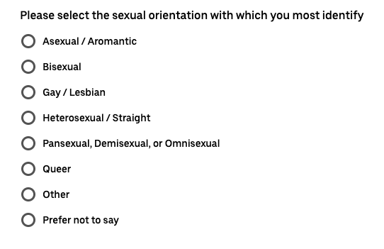 >>108699175I always, always put "Prefer not to say". What business is it of theirs? If they want gays, too bad; they're getting me instead. If they don't want gays, who cares? If they want giga-woke points for some demisexual stargender, I can pretend to be that if I think it's a good idea when I meet them.