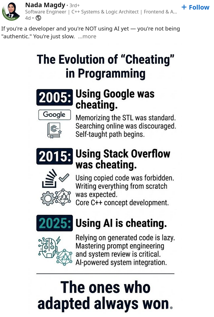 >>108694866Fundamentally, things haven't changed from a practical standpoint. The Pareto Principle is more optimized with AI. Previously, you have 80% of devs slacking off and doing minimal work while the 20% does most of the work. Now that lazy and incompetent 80% is replaced with AI. There's no way for the lazy devs to weasel themselves away out of work.