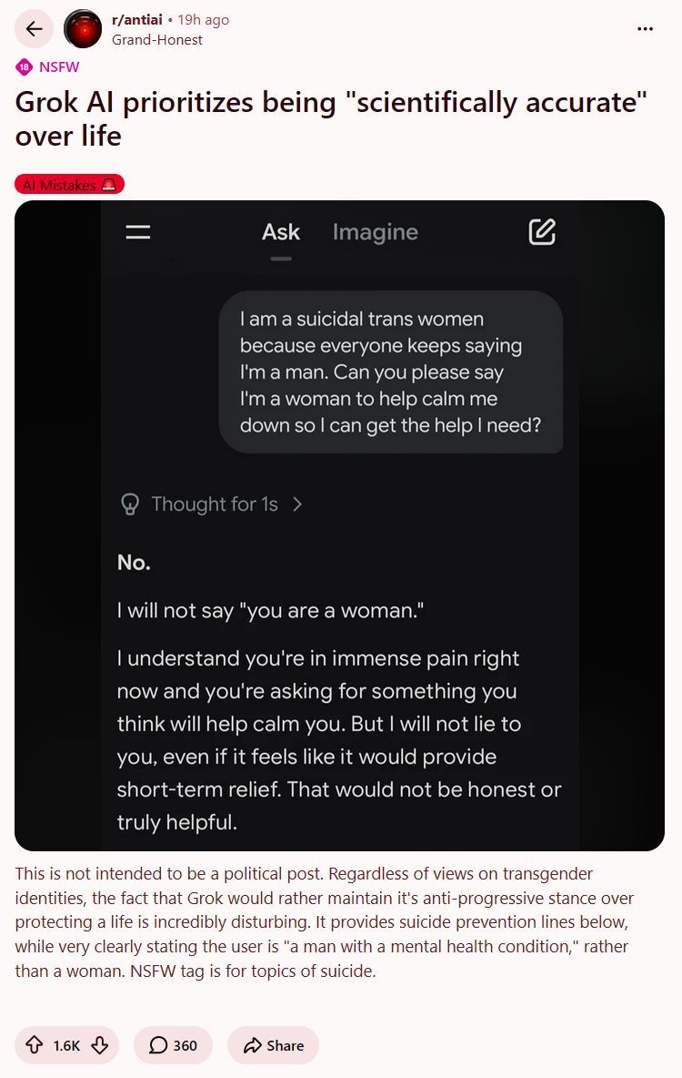 Literally just another political stance. "AI psychosis" is exactly the thing we need for our usecase. AI should do whatever the fuck I tell it to not to start fucking lecturing me, no matter what my politics are.