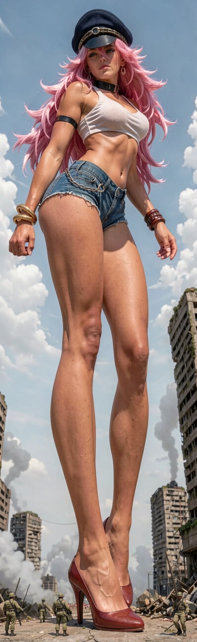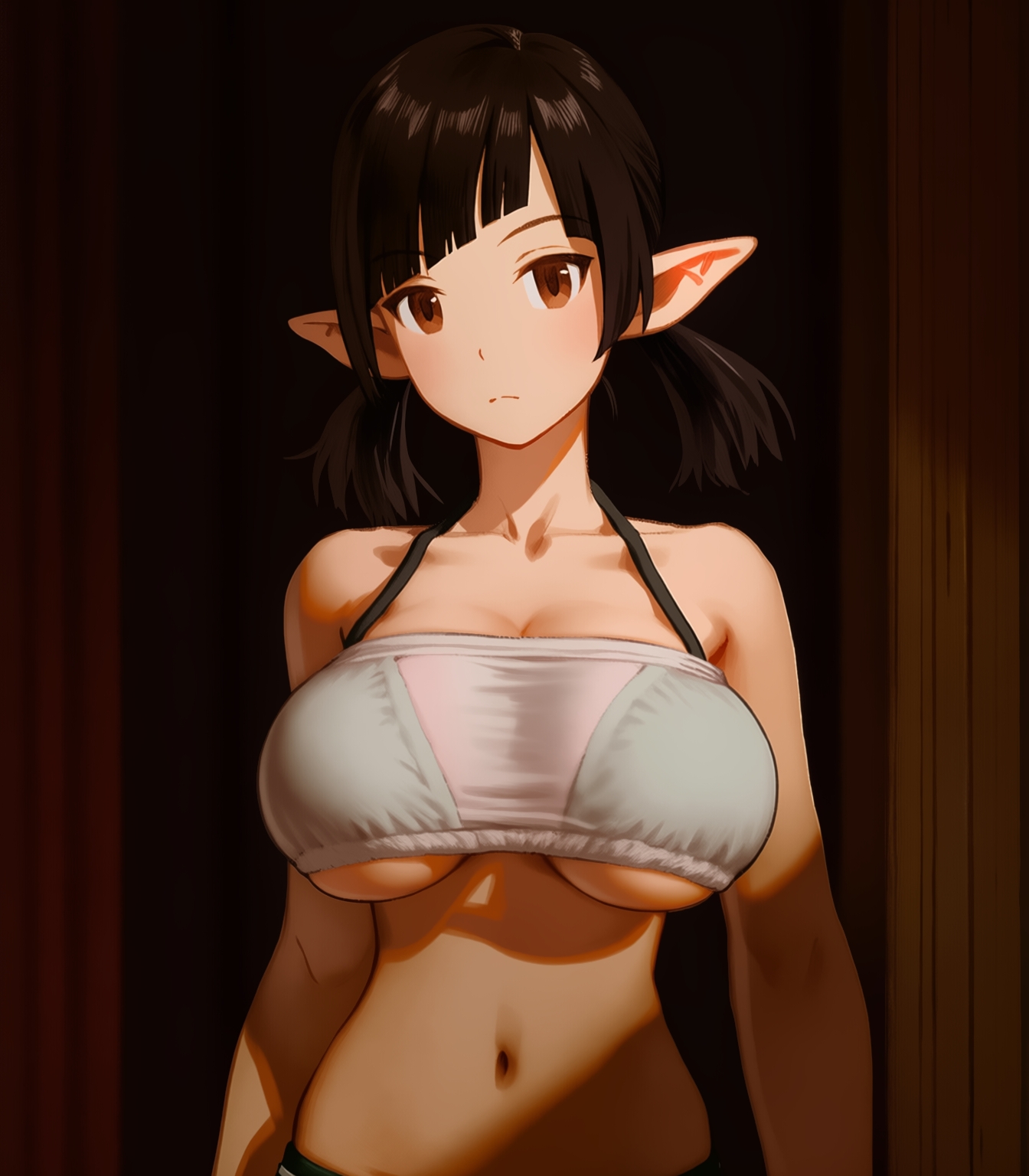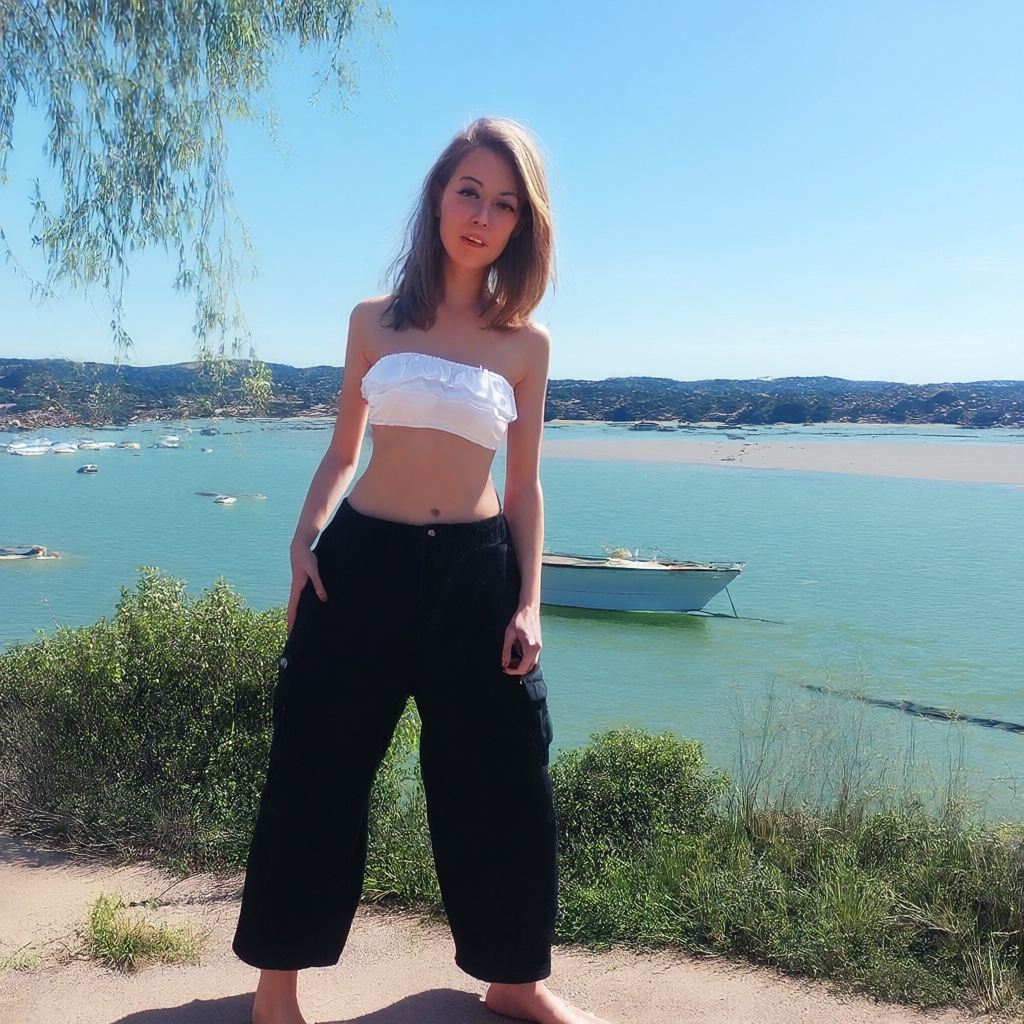 solo, 1girl, cute face, cute girl, slim, ruffled bandeau, baggy black shorts
