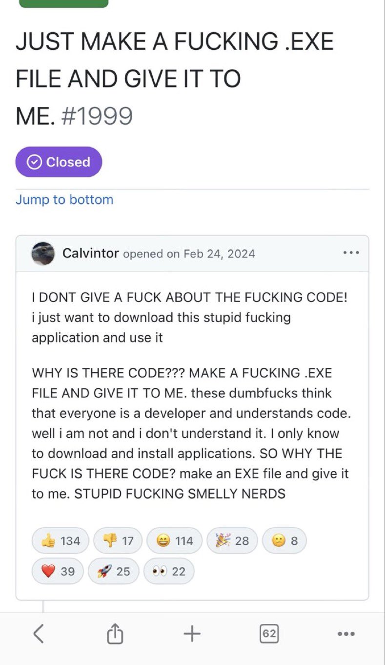 >I DONT GIVE A FUCK ABOUT THE FUCKING CODE! i just want to download this stupid fucking application and use it>WHY IS THERE CODE??? MAKE A FUCKING .EXE FILE AND GIVE IT TO ME. these dumbfucks think that everyone is a developer and understands code. well i am not and i don't understand it. I only know to download and install applications. SO WHY THE FUCK IS THERE CODE? make an EXE file and give it to me. STUPID FUCKING SMELLY NERDS