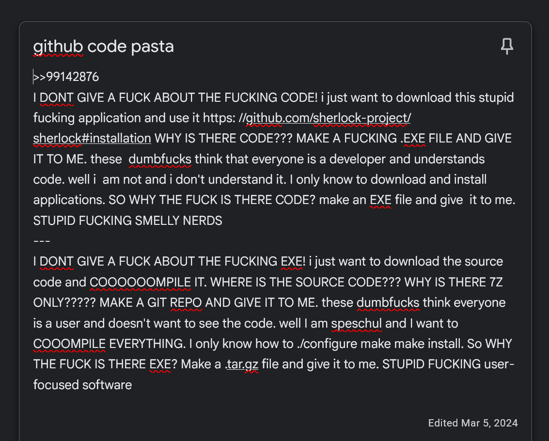 >>108697108I agree.For reference, I do write code. And when I hand it over, I tell people 'press this button & it should work'. I dont make them read a fucking manifesto to use the damn thing.The whole CS industry is filled with gatekeeping gaslighting elitist snobs who cant code for shit.