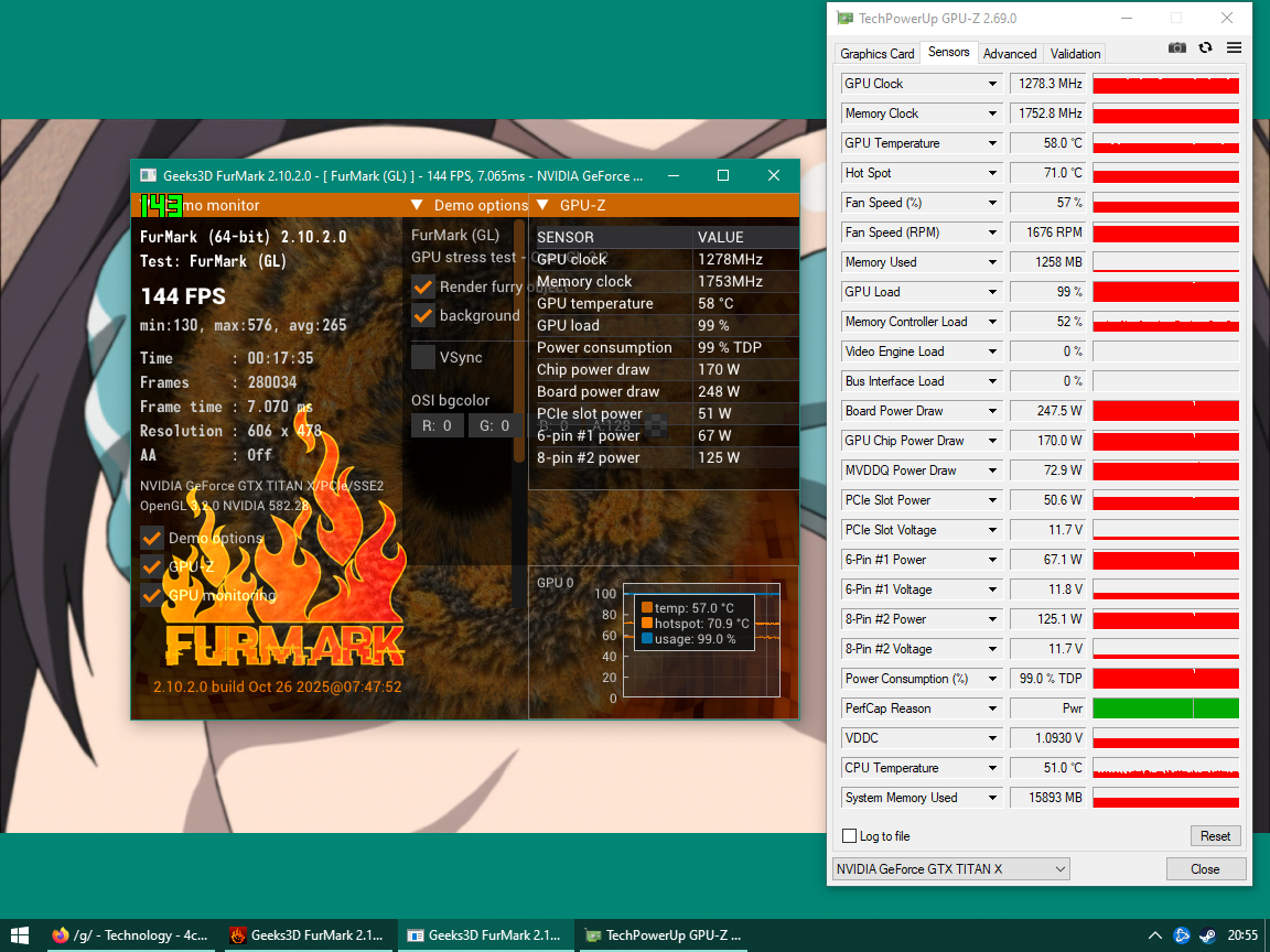 >>108697725I don't need to change thermal paste, it has ptm. It did this right out of the box, because it's a 2 slot dual fan 6700xt. They just run 110'c out of the box in furmark. I capped tdp so it would stay around 105'c max instead.