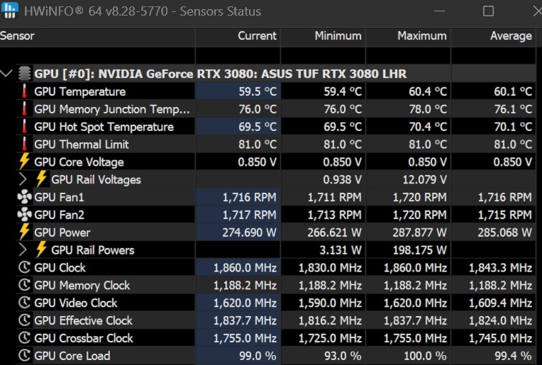 I changed my 3080s pads some time ago10min 99% workload hovers around 60c while gpu eats 280w