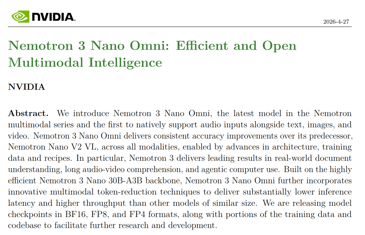 Omnimodal Sloppatronhttps://huggingface.co/blog/nvidia/nemotron-3-nano-omni-multimodal-intelligencehttps://research.nvidia.com/labs/nemotron/files/NVIDIA-Nemotron-3-Omni-report.pdfhttps://huggingface.co/nvidia/Nemotron-3-Nano-Omni-30B-A3B-Reasoning-BF16