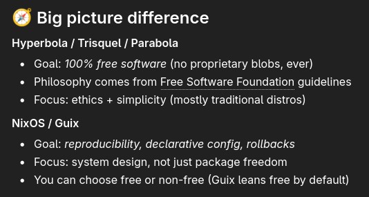>>108710372Guix has linux-libre or hurd which is experimental or linux in nonguix channel. Well Guix is pronounded geeks so what about that.>>108710481When I tried Nix it was a cluster of poor API with nix-env, nix home was a pain to setup, and apparently snowflakes are there which are half baked. Guix had less packages right now but it is by far the fastest packaged distro in existence. I broke the repology stats. All with a much smaller amount of devs.>>108710511Yes and yes.Guix Home works well unlike Nix Home.>>108710585If you install Guix on a foreign distros it works because packages are in the store which is a separate directory.