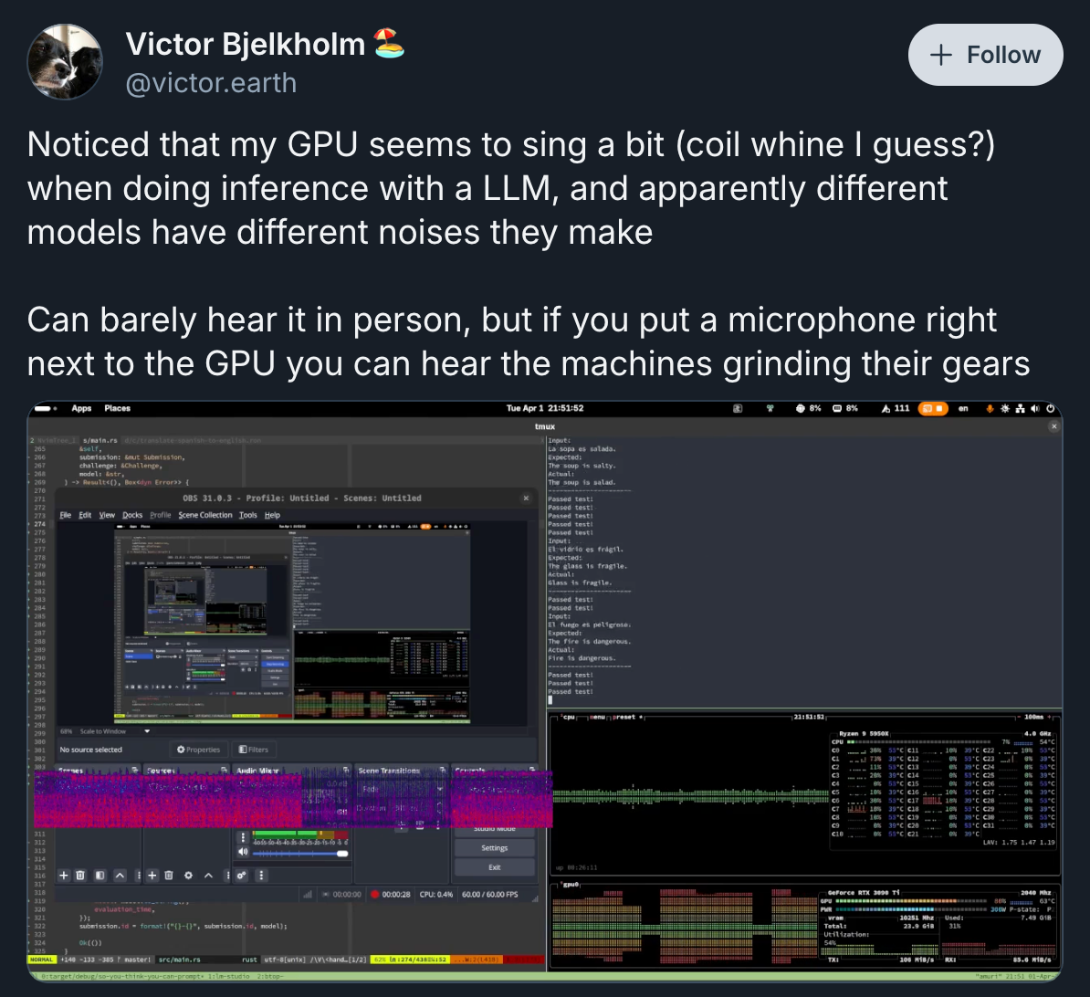 I noticed that with comfyUI, different workflows produced different coil whine. different patterns even.