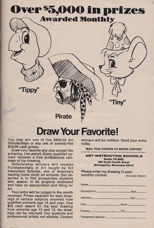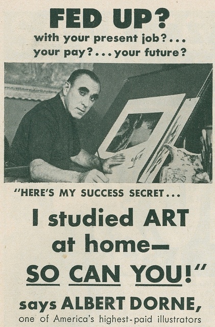 >>463070Questionable schools blowing smoke up clueless people's asses is a separate issue that existed even when commercial art as a standalone career was a fairly easy and profitable path to take with a seemingly endless supply of work to go around.Just like countless other trade school models that kind of thing exploded after WW2 with the GI Bill and continued with similar civilian educational loan programs long past a time when more workers were needed, and since the real goal of many operators was getting at that money and not placing people in jobs, much of the curriculum didn't keep up with the needs and trends in the industries that those schools ostensibly served.School has its place but just getting a certificate and expecting commercial design work to be there for the taking is the laziest, least creative and least adaptive approach to entering a field that is ALL about creativity and adaptation and hustling.Even to work as a teacher at art school, having completed art school doesn't necessarily mean crap.>“Art school for everyone everywhere” read one FAS ad, which ran in the back of magazines such as TV Guide and Life. For $200, or GI benefits, the student received large binders containing 24 lessons. >Charles Reid, who joined FAS in 1963 as its youngest instructor, noted that with the early lessons, students received a stock letter response according to their skill level...Uniquely, Reid started with FAS as a 15-year-old student, when his father bought him the course. He only completed eight of the original lessons, then abandoned the course, citing its difficulty.https://connecticuthistory.org/instruction-by-mail-the-famous-artists-school/