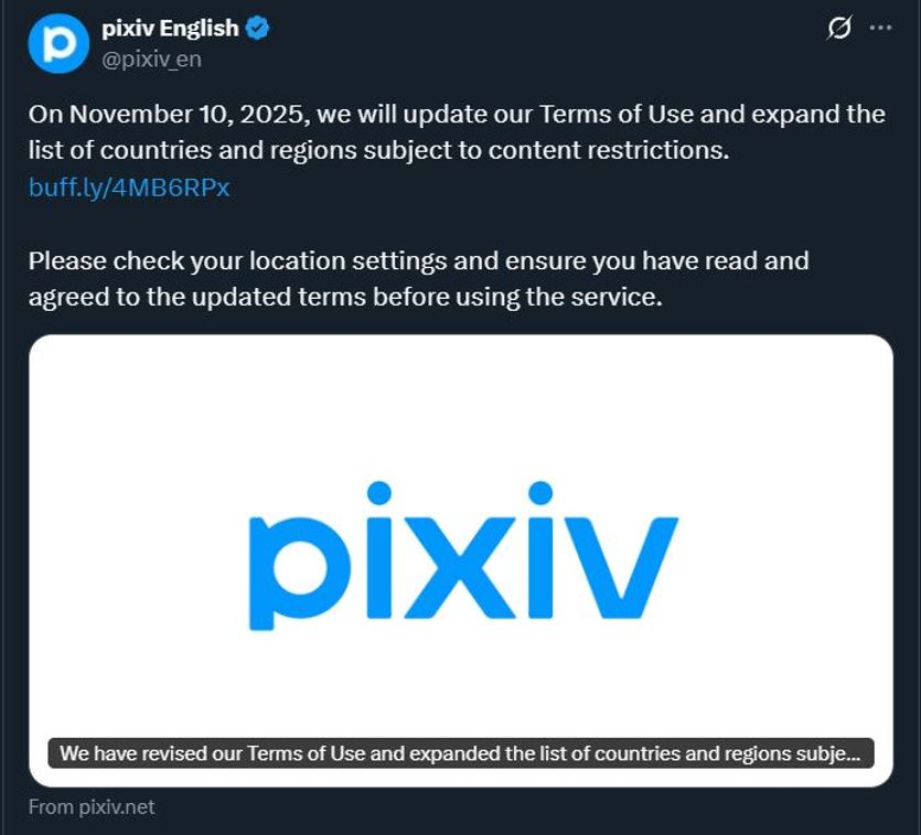 This include AI art. US may soon to follow.https://www.pixiv.net/info.php?id=12846>As of November 10th, 2025, pixiv will be updating the "Restrictions for Healthy Expression in Specific Countries and Regions" section of our Terms of Use to expand the list of applicable regions.>Works prohibited:>Revenge porn>Blackmail>Intimidation>Snuff>Torture>Death>Violence>IncestComment too long. Click here to view the full text.