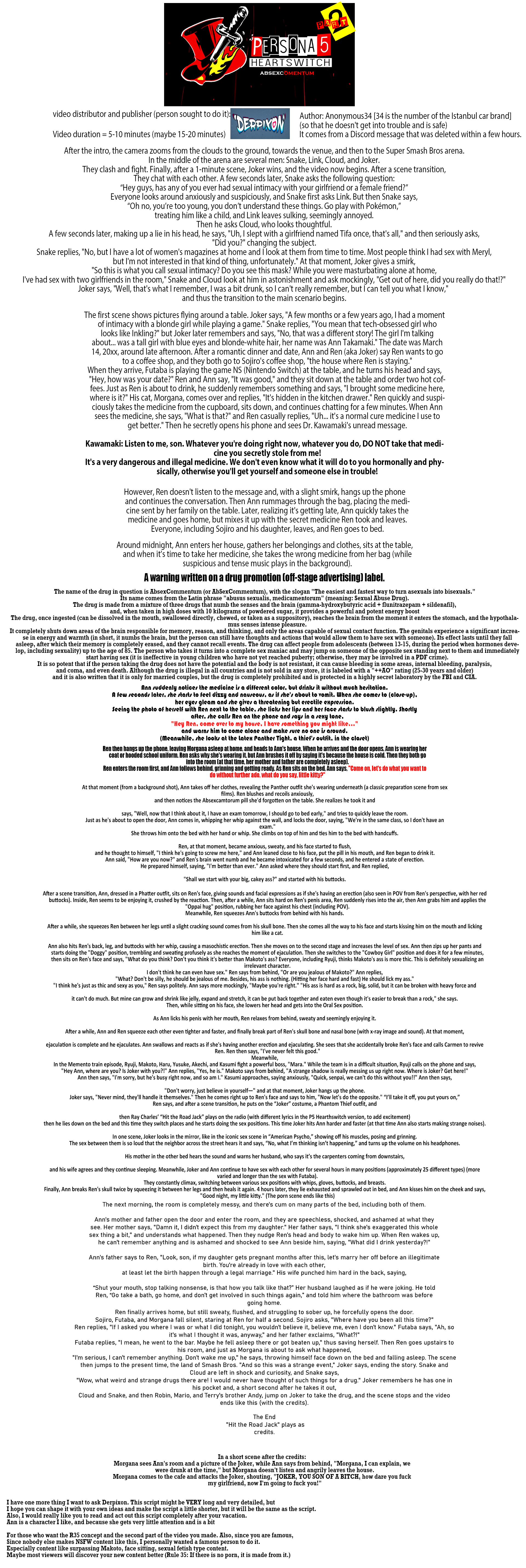 Hello, this is a script I'd like Derpixon to send. It's a request for a Persona 5 Heartswitch Part 2 video, a story script.Warning: The script is quite masochistic, containing references to illegal drugs, over 30 sex positions, and other content. All of this is entirely fictional and was created to fill a content gap for Ann and provide a high-quality video.It's up to you whether you share it with anyone, show interest, or do whatever you want with it. I ABSOLUTELY want Derpixon to see this script. The rest is up to them (whether they do it or not). Or it will change if someone else does it.Bye