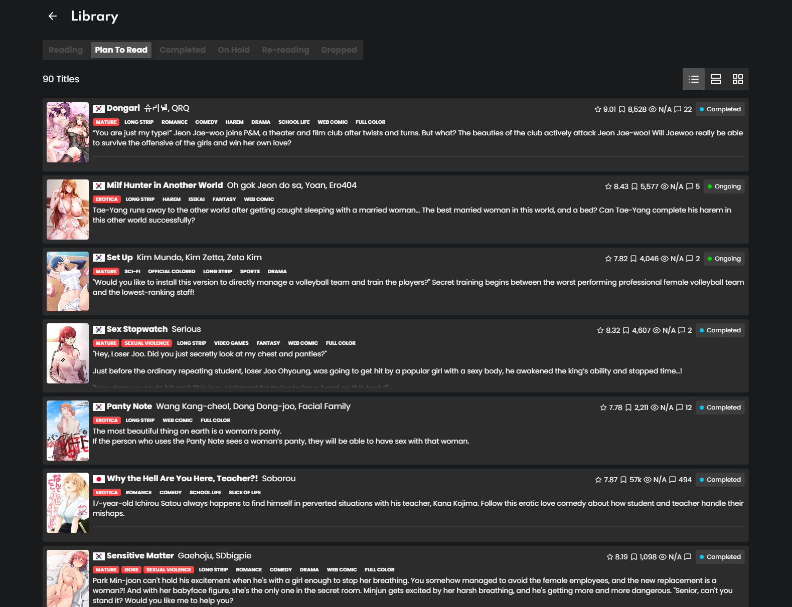 >>8724350Free sites to use:https://toonily.me/https://hentai20.io/https://manhwa18.com/https://www.webtoon.xyz/https://manhwa-raw.com/https://mangaforfree.com/https://omegascans.org/https://theblank.net/Paid sites:https://daycomics.com/https://www.lezhinus.com/Mobile reader apps for android:https://mihon.app/https://kotatsu.app/Useful links:https://www.reddit.com/r/pornhwa/comments/tb48ut/read_this_adult_manhwas_starter_pack_for_all_the/Sex scenes list:https://silly-store-21f.notion.site/1d0b788897fb488d949a832268d1b0d3?v=a1ad3016fbab4a9892593afe1db90934