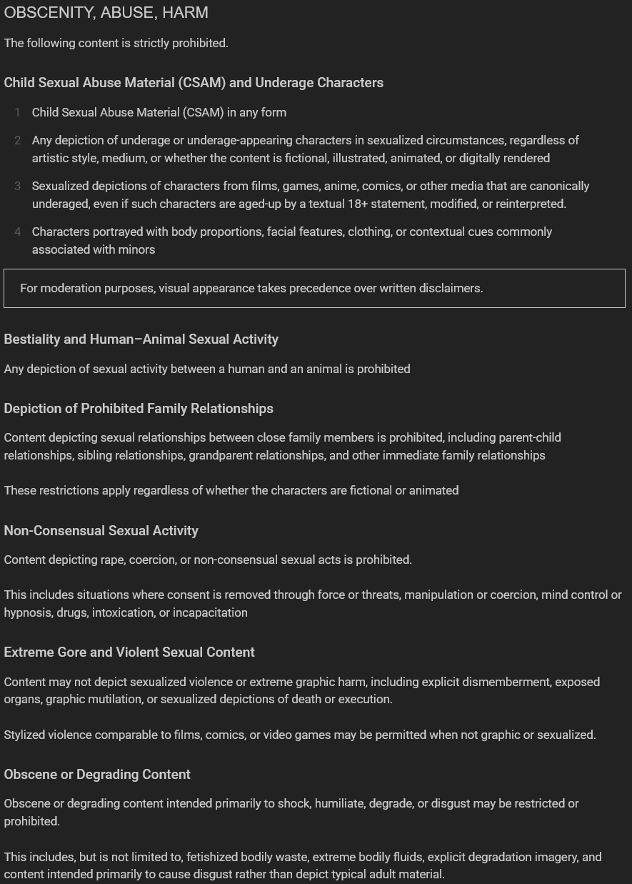 >>8756115>Posting or otherwise sharing any posted information that depicts or involves the exploitation of any person, whether real or simulated (including AI-generated), whose age is below the greater of the following:>a. 18 years old>b. The age of majority in the User's applicable country or region>2. Posting or otherwise sharing any posted information that appears to depict or involve a minor engaged in graphic bestiality, sadistic or masochistic abuse, or sexual intercourse.>3. Posting or otherwise sharing any posted information depicting non-consensual sexual activity (including “deepfake” images), revenge porn, blackmail, intimidation, snuff, torture, death, violence, incest, racial slurs, or hate speech.>4. Posting or otherwise sharing any posted information that is obscene, illegal, unlawful, fraudulent, defamatory, libelous, abusive, lewd, invasive of personal privacy or publicity rights, harassing, hateful, racially or ethnically offensive, or encourages conduct that would be considered a criminal offense, give rise to civil liability, violates laws and regulations applicable to the country or region Users are using the Services from, or is otherwise inappropriate.>5. Posting or otherwise sharing any posted information that appeals to the prurient interest while also being patently offensive in light of community standards applicable to the country or region Users are using the Services from, and lacks serious literary, artistic, political, or scientific value, or otherwise violates any applicable obscenity laws, rules or regulations applicable to the country or region Users are using the Services from.