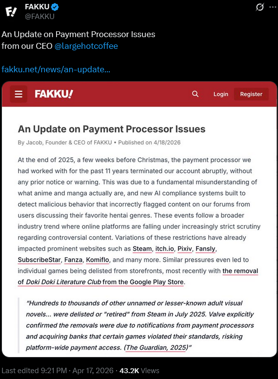>>8861335unsurprising. hypnosis has been """problematic""" on fanbox and other japanese sites since the crackdown in november 2022>>8862912>>8862640meanwhile these two faggots keep sperging out and I wish they would both kill themselves.Fakku (whatever you think of them) have an interesting post in the last 24 hours finally coming public with the payment processor bullshit they've had to deal with recently.picrel:https://x.com/FAKKU/status/2045356931603435883https://www.fakku.net/news/an-update-on-payment-processor-issues