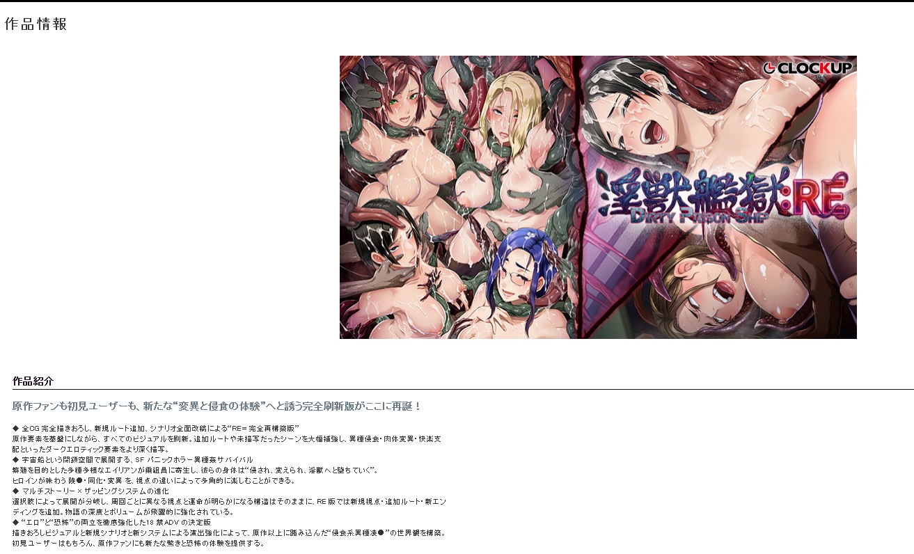 >>8776996Fanza Update the site and descriptions + characterstranslation:Game OverviewWhether you’re a fan of the original or a first-time player, this completely revamped edition invites you to a new “experience of mutation and invasion”!◆ “RE = Completely Rebuilt Edition” featuring all-new CG illustrations, additional routes, and a fully rewritten scenarioWhile retaining the essence of the original, all visuals have been completely revamped. Additional routes and previously unexplored scenes have been significantly expanded, allowing for a deeper exploration of dark erotic elements such as alien invasion, physical mutation, and the pursuit of pleasure.◆ A sci-fi panic horror alien sex survival story unfolding in the confined space of a spaceshipA wide variety of aliens, intent on reproduction, parasitize the crew, and their bodies are “invaded, transformed, and fall into becoming lustful beasts.”You can enjoy the rape, assimilation, and mutation experienced by the heroines from multiple perspectives.◆ Evolution of the Multi-Story × Zapping SystemWhile retaining the structure where choices branch the story and reveal different perspectives and fates with each playthrough, the RE version adds new perspectives, additional routes, and new endings. The depth and volume of the story have been dramatically enhanced.◆ The Definitive 18+ ADV That Thoroughly Balances “Eroticism” and ‘Horror’Through newly drawn visuals, new scenarios, and enhanced presentation via new systems, we have constructed a “corrosive alien rape” worldview that goes even deeper than the original.It offers a new experience of surprise and horror not only to first-time players but also to fans of the original.