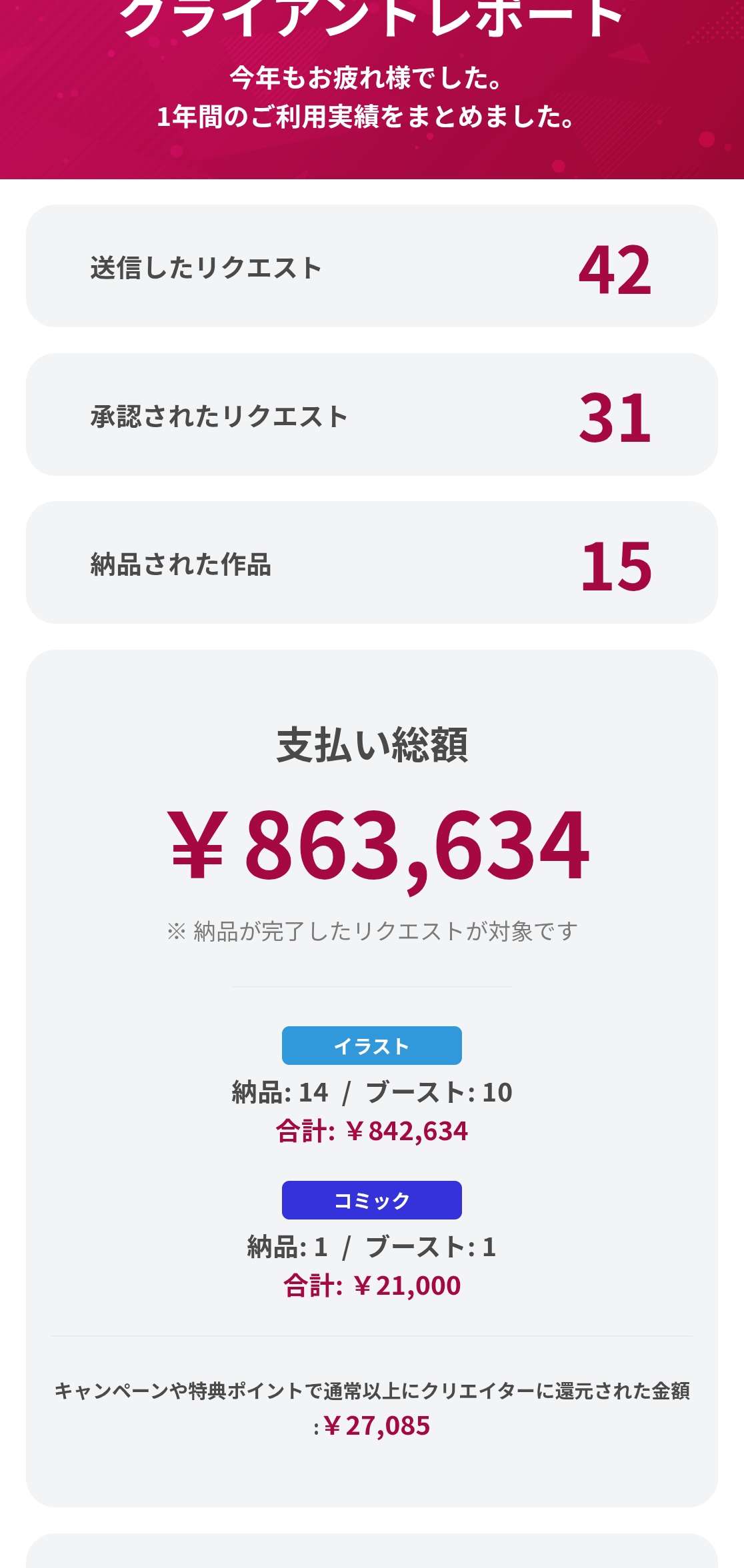 I've been making fewer and fewer requests/traditional commissions as the years go by.I think part of it is due to the advent of AI which has pushed my standards up significantly, shrinking the pool of available artists I want to commission. And then I think the other reason is Skeb still hasn't made any meaningful improvements when it comes to discovery. Based on the previous thread, it seems like many anons were trying to cut back this year; I actually wanted to increase my spend in 2025, but spending hours and hours browsing Skeb and Twitter becomes draining at some point.The site has been in "beta" for 6 or 7 years now, yet there's no way to filter/search for artists based on recommended price/average delivery days. How about a tagging system for artists to advertise what genres they specialize in? How about allowing users that've spent X,000,000 yen to open as many tabs as they want without being rate limited into the ground? Sometimes it seems like Nalgami is more interested in crypto or arguing with people on Twitter than improving his site for both clients and creators.Also I thought I spent a lot this year, but some of you guys must be oil barons or something.