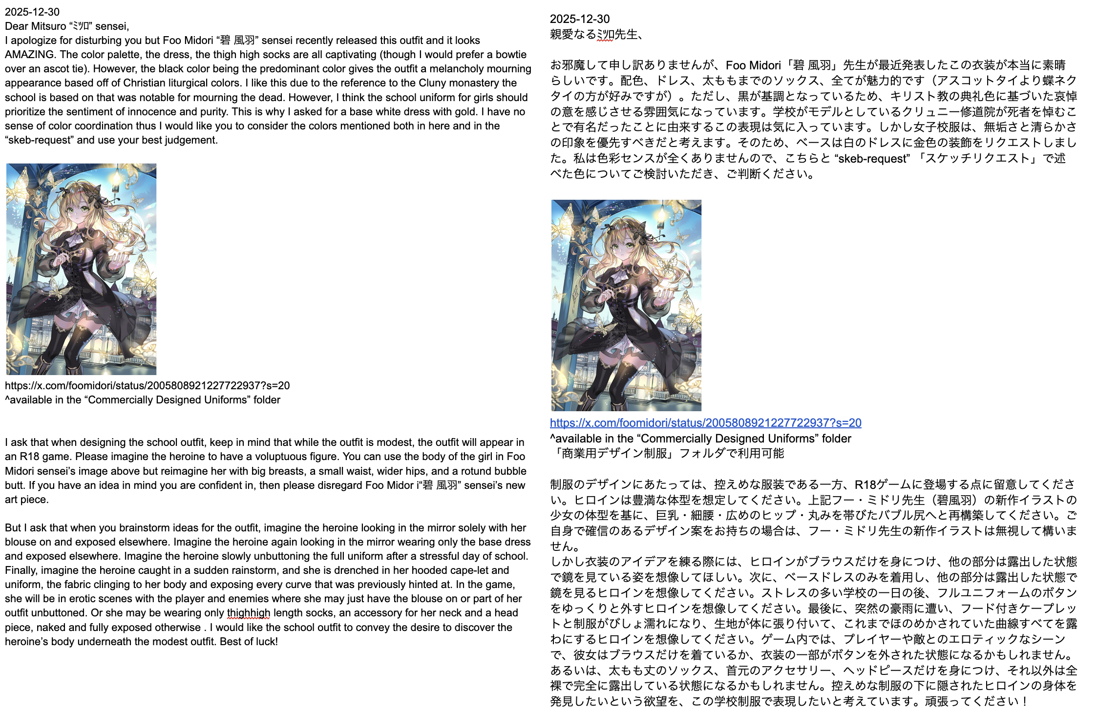 >>8805953See, Mitsuro said to be as descriptive as possible for the skeb-request (but I was locked to 1K characters when I had so much more for my previous request). Also, again, this just releasedhttps://x.com/foomidori/status/2005808921227722937?s=20And I couldn't help but rave about this outfit. If I had waited a couple days before sending that request I would have seen this, and would have completely changed my request.