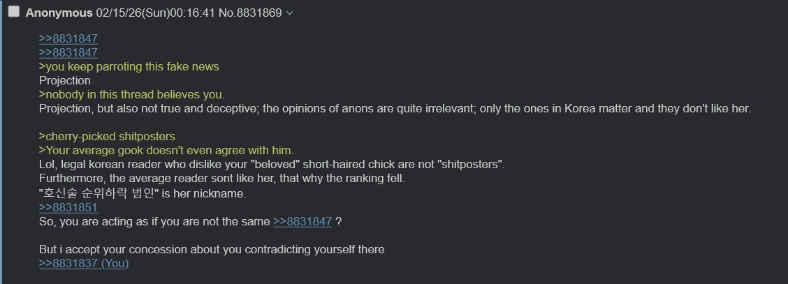 >>8831847>>8831847>you keep parroting this fake news Projection>nobody in this thread believes you.Projection, but also not true and deceptive; the opinions of anons are quite irrelevant; only the ones in Korea matter and they don't like her.>cherry-picked shitposters>Your average gook doesn't even agree with him.Lol, legal korean reader who dislike your "beloved" short-haired chick are not "shitposters".Furthermore, the average reader sont like her, that why the ranking fell."호신술 순위하락 범인" is her nickname.>>8831851So, you are acting as if you are not the same >>8831847 ?But i accept your concession about you contradicting yourself there>>8831837