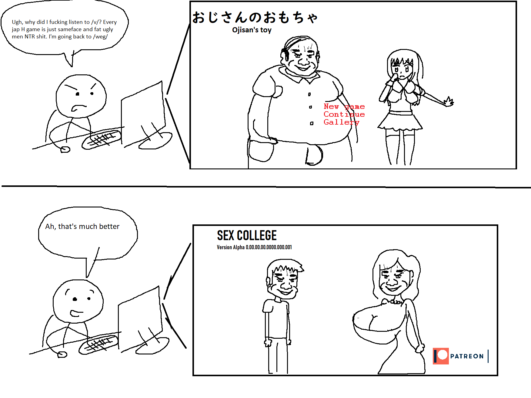 >>8838748That FMC is clearly made for teasing, dominant NTS; I can already picture her giving the player a handjob while she stretches out her date report as long as possible before revealing whether she actually had sex or not. Pair her up with a wimpy, submissive MC for maximum effect.Make everything optional. NTS is a very easy fetish to mess up; the slightest things can be a turn off to somebody. See, for example, all the flame wars above about BBC. All of that could be avoided if games just made vanilla the default and added BBC as an option.But as long as it is optional, don't be afraid to carter to the more extreme fetishes. Defloration NTS, cum kissing, creampie eating, bull pregnancy, etc.Use Ren'Py! So many devs neglect crucial features like "Save Anytime" and "Skip Through Seen Dialogue" and "Conversation Log" whenever they reinvent the wheel in Unity, or, worse, use RPGM. Ren'Py just works!Real artists ship. One of the biggest problems WEG devs have is that they get a bug up their ass about how they could make the game better and end up remaking their games over and over (Blurring the Walls, Into Your Heart) or adding completely unnecessary features like combat (Broken Sky, Inanna Revenge) with the result that the damn game never gets finished.Try to keep the file-size under 1 GB. Use JPEG or WEBP instead of PNG.