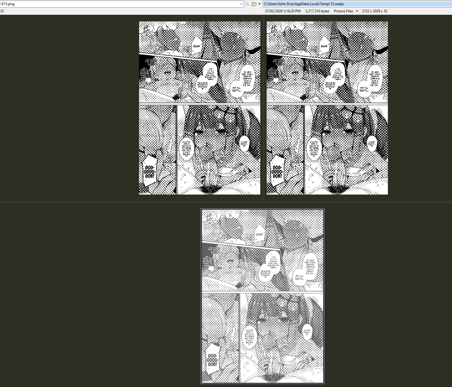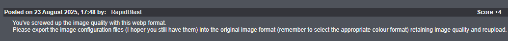 I stopped bothering visiting exhentai when WebP became the rule. I don't mind the "quality" loss, but having to deal with a format that you can't tamper with normally anywhere without converting it first is something I just forgive.You can crop images to make reactions, you can't post pages or images on 4chan, you can't use them on most used hosting image sites that allow galleries.Whatever you want to do you have to convert it first. That's bullshit.Pic unrelated