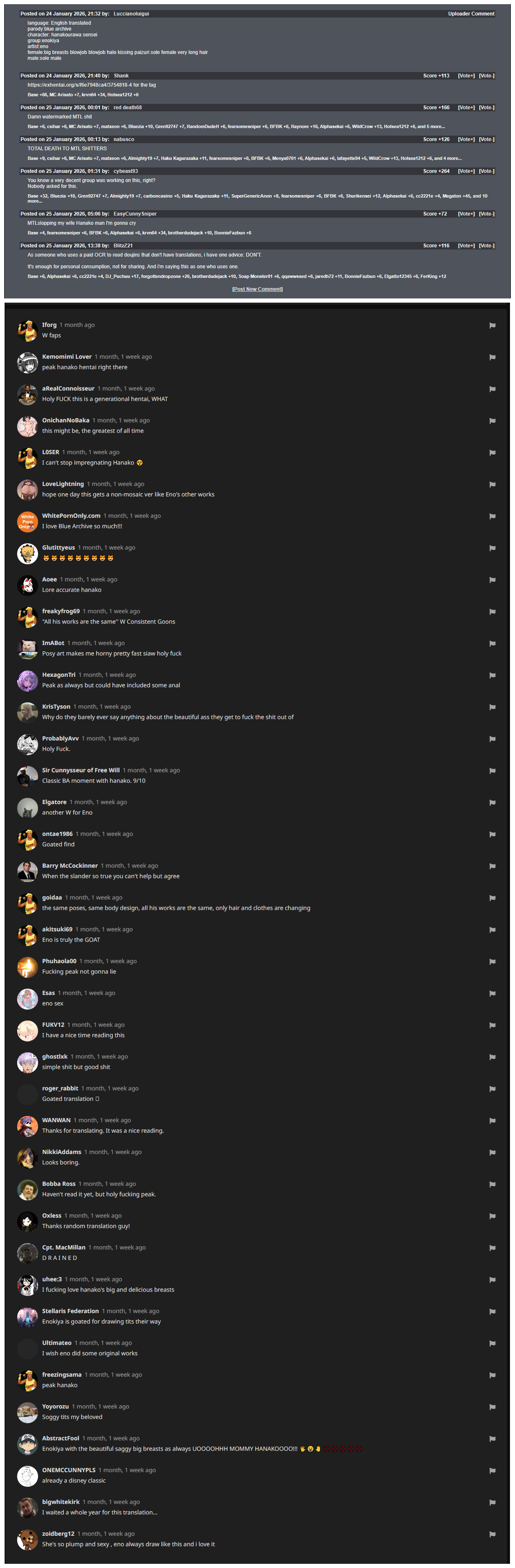 Why nu-panda users are so obsessed with translations? It's all just non stop circlejerking over TL instead of talking about the content of the gallery. They're too poor to commission a proper translation, and too dumb to learn Japanese; So it's all just nonstop crying about MTL even though they're willingly entered a gallery with "rough grammar" and/or MTL on the tags and the title.What's interesting is that they're totally fine with butchered / localized TL as long as it was done by a "human", so it doesn't seems like they're looking for a proper, standardized translations. They're just seething uncontrollably over machine translations for the sake of it.And it's only with ENG galleries. CN users and KR users have no issue with Chinese/Korean MTL. You can see it yourself that they're free from vote bombing, unlike ENG MTL galleries. Why is that?Picrel was taken as a comparison at how the majority of users from other sites doesn't even care. Exact same gallery. It's just a problem with panda/e-h users.
