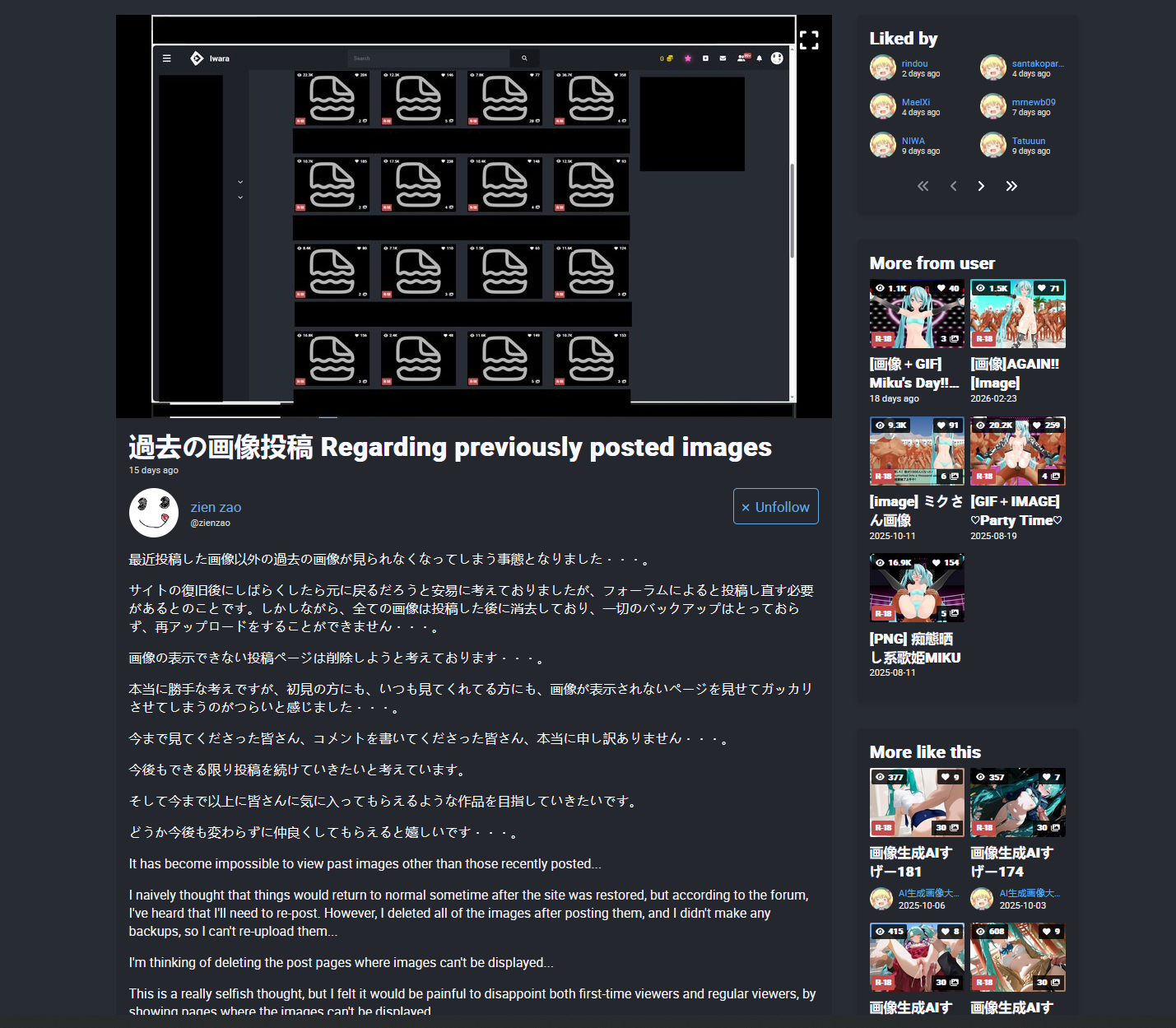>>8844149I to be honest did it intentionally. When I was browsing Kemono or whatever similar site, I just hated that the files I wanted were unavailable merely because the publisher had deleted the links, so I hope nobody else will suffer the same as I did. And>>8844156you are right. It's just a matter of time until the one who I keep trying to avoid gets found again. But I just love making ero MMD so much, so the only thing I can do is to keep myself low-key even though I can´t benefit at all from the production... Besides this, I have no idea what else I can do