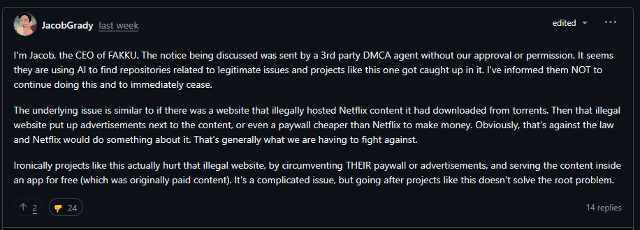 Fakku is on Reddit, saying they never told any free software repo owner to censor information.