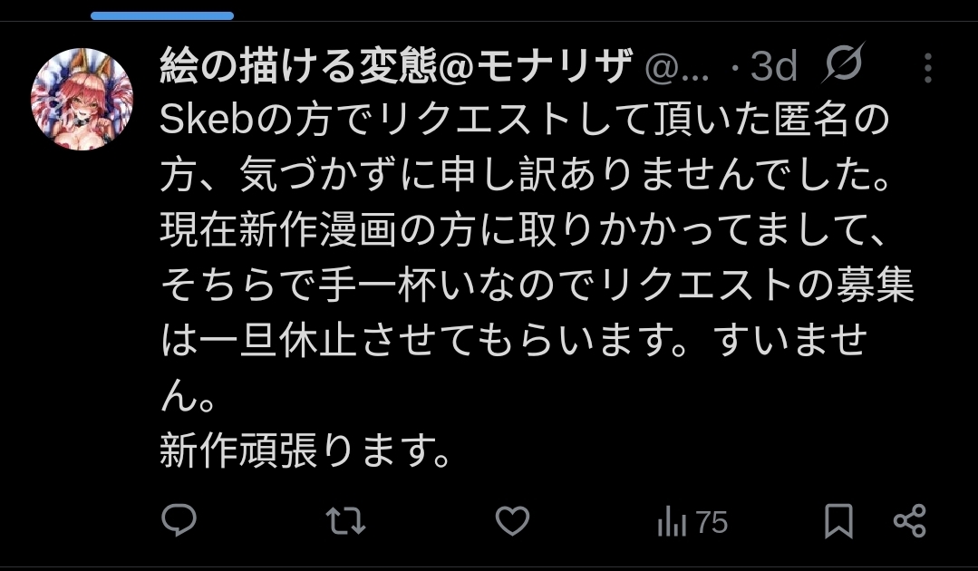 >>8859270Anon the artist is saying they can't take reqs and they're closing Skeb for the moment because they're busy on their next manga project. It's good news simply because it's a confirmation that they're not dead.