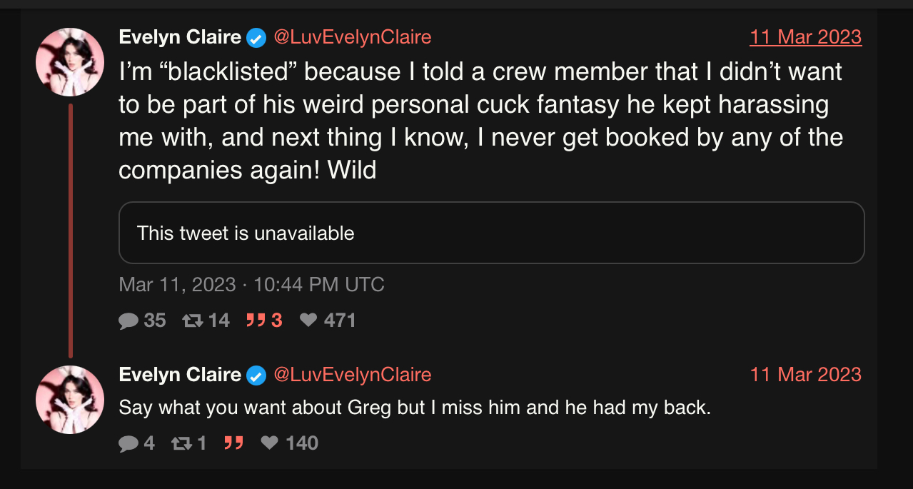 >>2575859Evelyn thinks she is being punished for not wanting to be in weird cuck fantasies by no longer being booked for Blacked.