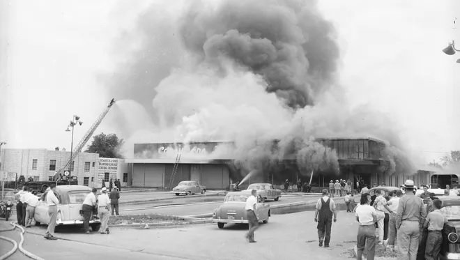 >If you are wondering this 4th of July weekend why fireworks are illegal to sell in Springfield, Missouri, you might ask your grandfather for the answer. On Tuesday, June 28, 1955, a fireworks stand at Consumer Warehouse, a grocery store in downtown Springfield, accidentally erupted, causing a fire and explosion that gutted the store. Thirty-three persons were inside the store at the time; most escaped unharmed. Three fatalities resulted--Margaret Click, 56, Mary Williams, 11, and her sister Linda, 7. The three had huddled in the women's restroom for cover, but died of smoke inhalation. Their mistake was not using an exit door near the restroom that would lead outside.>Danny Dittrick, who was 19 at the time and a store employee, recalled trying to put out the fire with puny handheld extinguishers. "It blew the roof of the building off. It wasn't something I'd want to go through again." He passed out from smoke inhalation, but firefighters rescued him and he recovered after a few days in the hospital. Lawyers tried to get him to sue Consumer Warehouse for gross negligence but he declined out of loyalty to his employer.