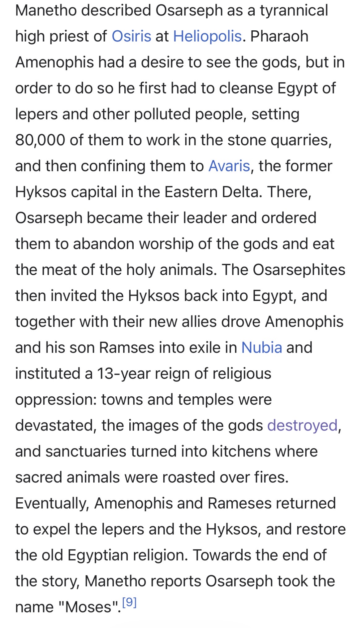 >According to Josephus’s quotation of Manetho (Against Apion I.26–31), Osarseph was an Ancient Egyptian priest from Heliopolis who led a revolt of people described as lepers and “unclean” against a pharaoh named Amenophis (the Greek form of Amenhotep II). The rebels allied themselves with the expelled Hyksos, who, according to Josephus, returned from the region later associated with Jerusalem in his narrative, to join them in despoiling Egypt, before being expelled once more when Amenophis regained power. Toward the end of the story, Osarseph is said to have changed his name to Moses.Manetho was right, Exodus was Israelite propaganda.