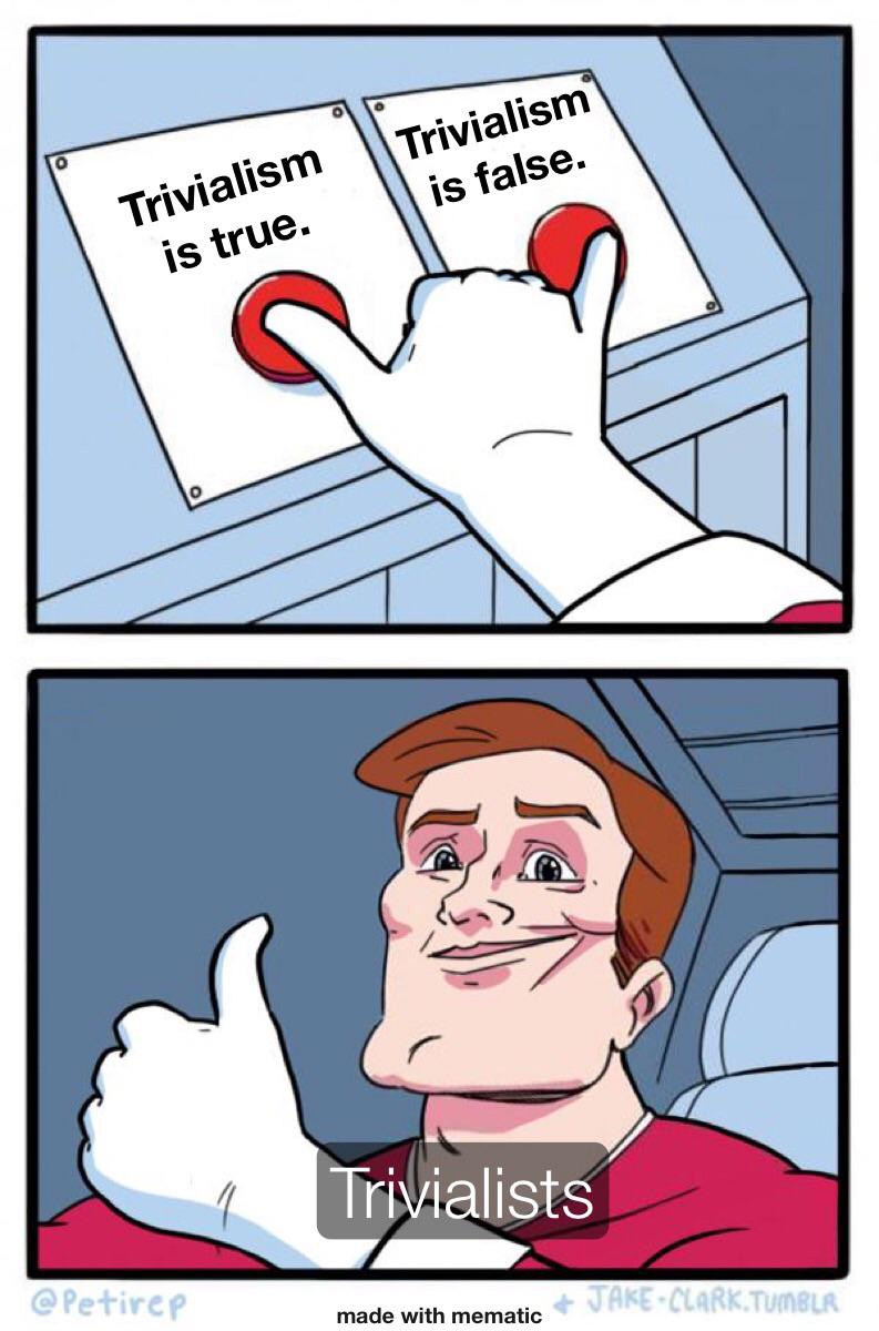 tldr at the bottomI am a Trivialist. I believe everything is true. Yes. EVERYTHING. >b-b-but that's inconsistent because you would have to believe the statement "trivialism is false" is true which refutes your own theory!Actually yes, I do believe that. I fully accept it. It is indeed true that Trivialism is false, and it's false because it's true. I have no problem accepting this. You cannot refute Trivialism because Trivialists will always agree with whatever my opponent says. It's trivially true! (pun intended lol) But also, you can refute Trivialism, because everything is true, since by definition Trivialism is true ;) No matter what you cannot refute me. Go ahead, radical skeptics, I dare you, try and debate me. You literally will never win. Trivialism is an undefeatable position. >how do you know it's true!A simple paradox arising in classical logic, called Curry's Paradox, strongly implies it, since by this paradox you can conclude everything is true. The only way to avoid it is either to disallow self-referential statements like Curry's Paradox, which I honestly think is arbitrary, or to accept some really niche non-classical logic which is counter-intuitive to how we normally reason. Accepting Trivialism though gives me the benefit of accepting all options though! :)tldr; Trivialism is the belief that everything is true and you cannot refute it.