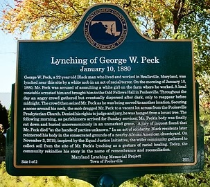 George Washington Peck was lynched in Poolesville, Maryland in 1880, just as the era of Jim Crow was beginning. Peck had lived in the Poolesville area his entire life, having been born there in 1858 as a slave owned by William Poole, whose family gave the town its name. Freedom came after the close of the Civil War and his name is recorded in the 1867 census of freed slaves although any family members he had are unknown. However Peck probably maintained contact with another former slave of Poole's, Louisa Lear, and her children, who continued to reside in the area after being freed. The 1870 census reports 12 year old Peck living with the family of a Howard Griffith near Beallsville.Peck was about 21 as 1880 began and working for Lemuel Beall, a local shopkeeper who also employed Louisa Lear as a cook. During the previous year, Beall had also hired an 11 year old white girl named Ada Hayes, whose family had recently moved to Poolesville from Virginia; her widowed mother had remarried to a man named Hyrocles Reeves. It is not known exactly where they were living at the time when Ada was killed and it may be that they all boarded with Beall or else lived somewhere else and the girl was living alone with him as hired help at his shop.