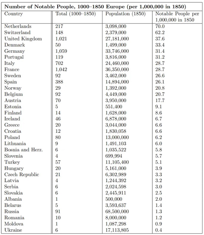 >inb4 Murray mapThe region with the highest percentage of notable people per population is the Netherlands, which he attributes to the Jews who caused a brain drain from Spain, lol.https://www.commentary.org/articles/charles-murray/jewish-genius/>After being expelled from Spain at the end of the 15th century, Sephardi Jews rose to distinction in many of the countries where they settled. Some economic historians have traced the decline of Spain after 1500, and the subsequent rise of the Netherlands, in part to the Sephardi commercial talent that was transferred from the one to the other. Centuries later, in England, one could point to such Sephardi eminences as Benjamin Disraeli and the economist David Ricardo>Samuel Pallache (Arabic: صامويل آل بالاتش, Samuil al-Baylash, Hebrew: שמואל פלאצ'ה, Shmuel Palache, c. 1550 – 4 February 1616) was a Jewish Moroccan merchant, diplomat, and pirate of the Pallache family, who, as envoy, concluded a treaty with the Dutch Republic in 1608. His antecedents fled to Morocco during the Reconquista. Appointed as an agent under the Saadi Sultan Zidan Abu Maali, Pallache traveled to the newly-independent Dutch Republic to discuss diplomatic terms with the Dutch against their mutual enemy, the Spanish. He died in the Netherlands, brought there due to the intervention of his ally, Maurice of Nassau, son of William the Silent, the father of Dutch Fatherland, who helped him when he was arrested by the Spanish